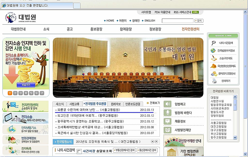 ![]() 韩国最高法院(大法院)网站主页上,法轮功难民胜诉案被列入韩国全国法院主要判决案例。 |