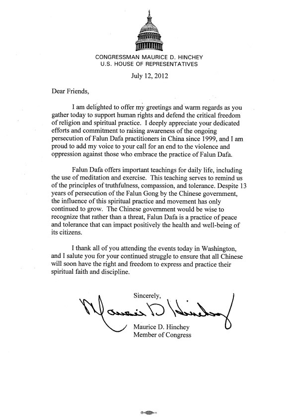 ![]() 美国国会议员默瑞斯•辛契给法轮功学员的支持信 |