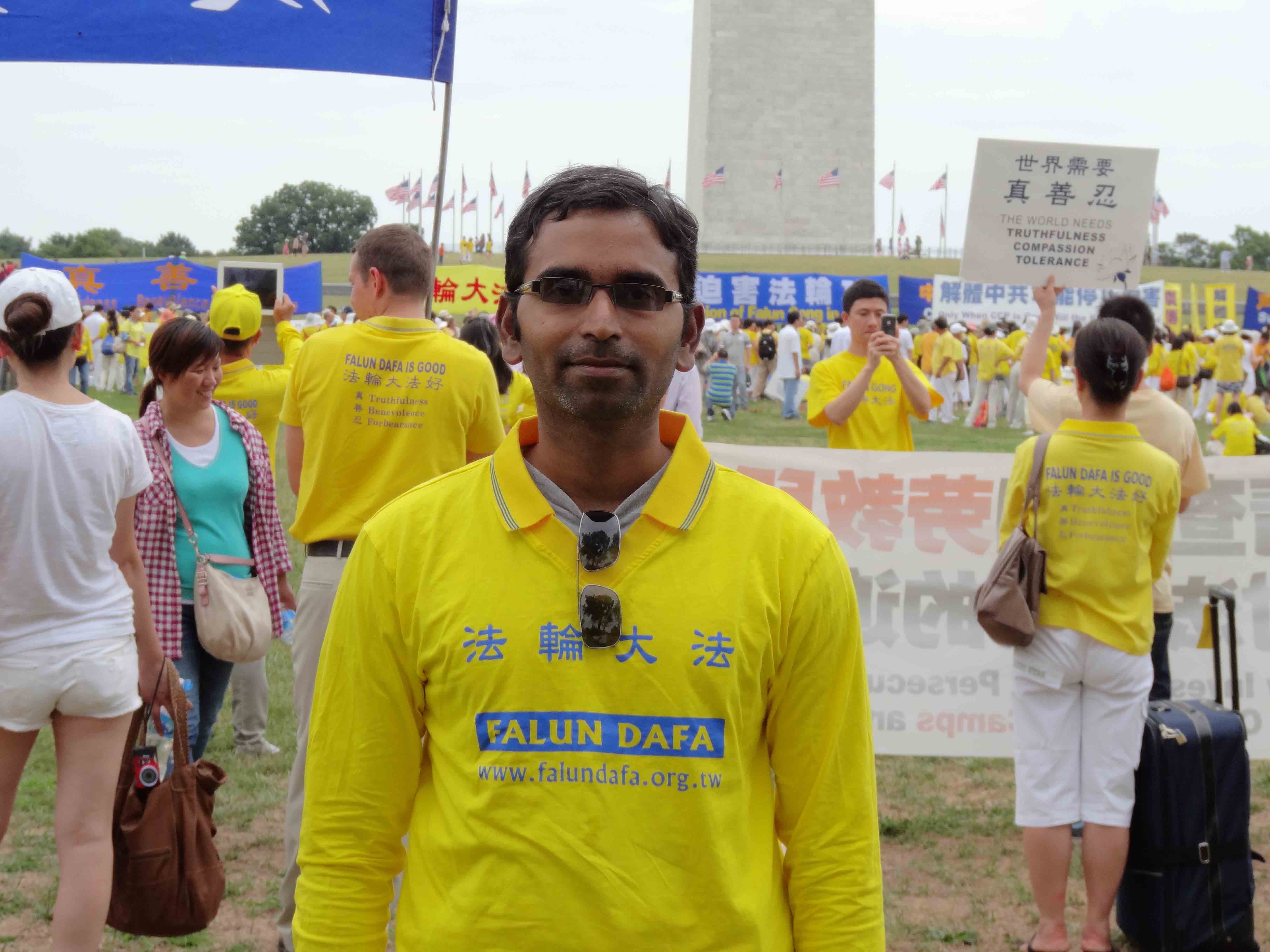 苏玛•斯瑞尼瓦司(Suman Srinivasan)先生是印度裔的法轮大法学员,他在印度得法,现在住在美国。他表示,这是他连续第十年来华盛顿DC参加七二零反迫害活动。一九九九年七月二十日,中共全面发动了对法轮功的迫害。他来到华盛顿DC,是利用这个机会来呼吁世人关注迫害的事实。在他十年的华盛顿DC反迫害活动的经历中,不变的信息是“法轮大法好”、“世界需要真善忍”、“停止迫害法轮功”等,同时他也看到了巨大的变化,经历了这么多年的残酷迫害,法轮功越来越强大,在世界进一步洪传,尤其是最近几年,游行中又加入了声援民众退出中共相关组织的分队,令他振奋,而且在来参加集会的学员中,他看到很多新学员,队伍更加壮大。