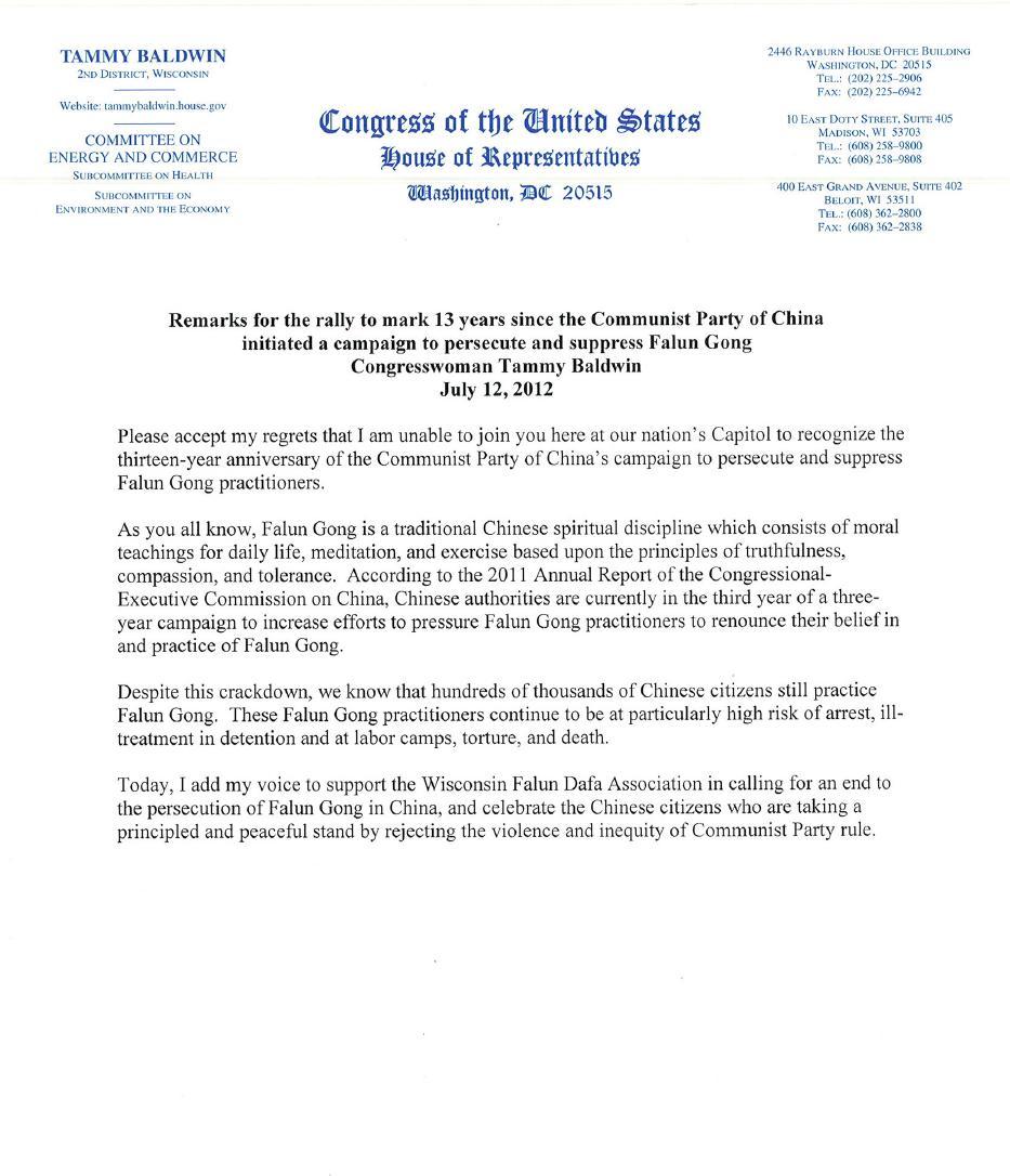 鲍德温议员表示:“今天,我同威斯康星州法轮大法学会一起,呼吁制止在中国对法轮功的打压和迫害,祝贺中国公民为反对暴力和中共专制的和平集会。”