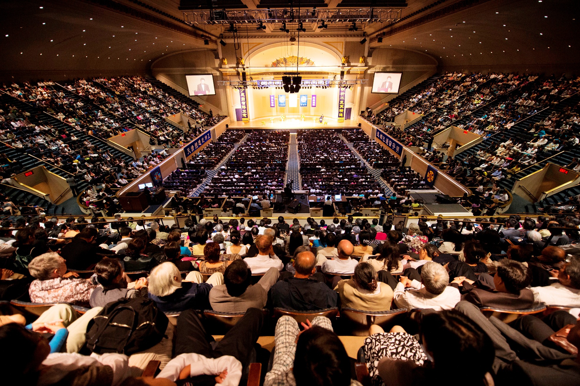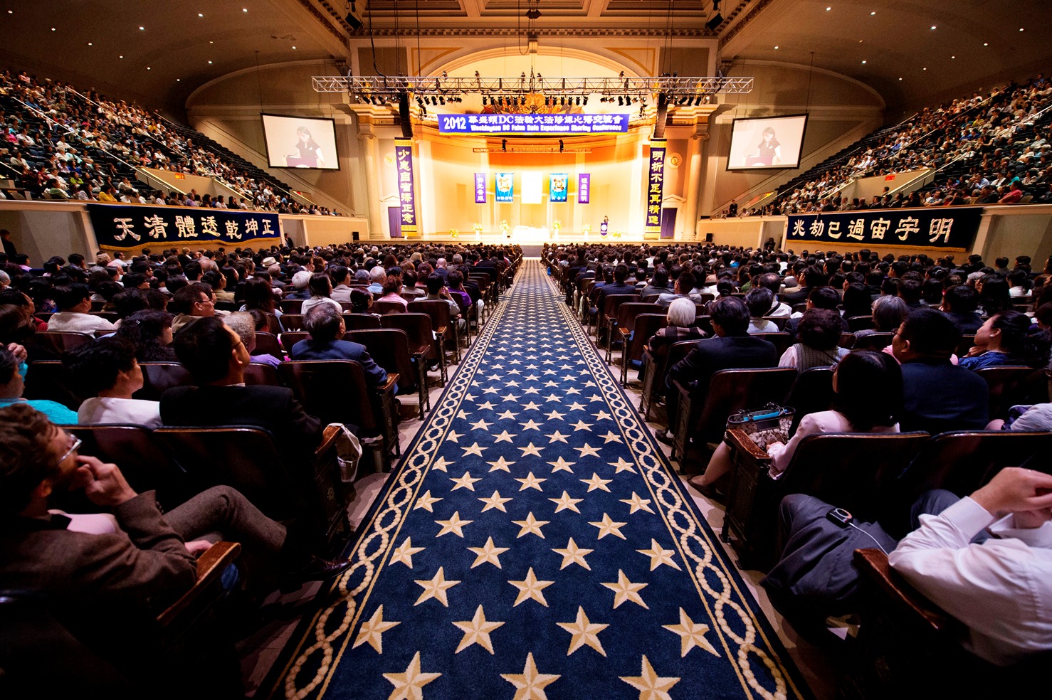 【明慧网二零一二年七月十五日】(明慧记者郑海山美国华府报道)二零一二年七月十四日,一年一度的美国华盛顿DC法轮大法修炼心得交流会在华盛顿DC市中心的宪法大厅(Constitution Hall)隆重召开。五千多名来自世界各地的法轮功学员参加了此次盛会。上午十一点十五分左右,李洪志师父亲临会场,全体大法弟子恭敬起立长时间热烈鼓掌。师尊给众弟子们讲法近四十分钟。