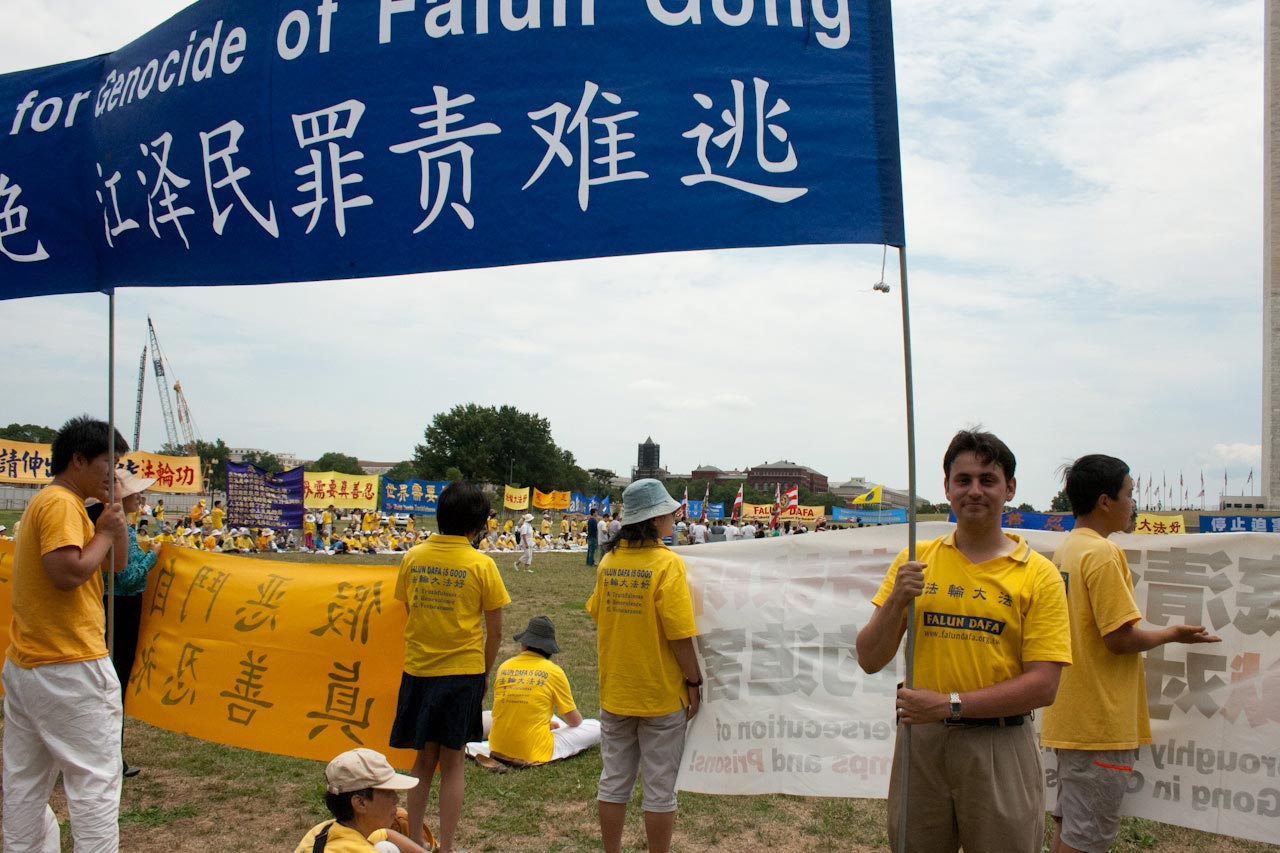 二零一二年七月十三日,逾三千名来自世界各地的法轮功学员在美国首府华盛顿特区,举办了“解体中共 停止迫害法轮功”的反迫害大游行,呼吁立即停止对法轮功长达十三年的迫害。行进的队伍中,法轮功学员及正义人士高举着“声援一亿两千万中国人退出中共党团队”、“迎接没有共产党的新中国”、“解体中共 结束迫害”等横幅和展板,很多沿途为游行队伍所震撼的人都在驻足观看,有的详细询问,希望能了解到法轮功学员举办游行的缘由,有的伸出大拇指或作出胜利的手势。