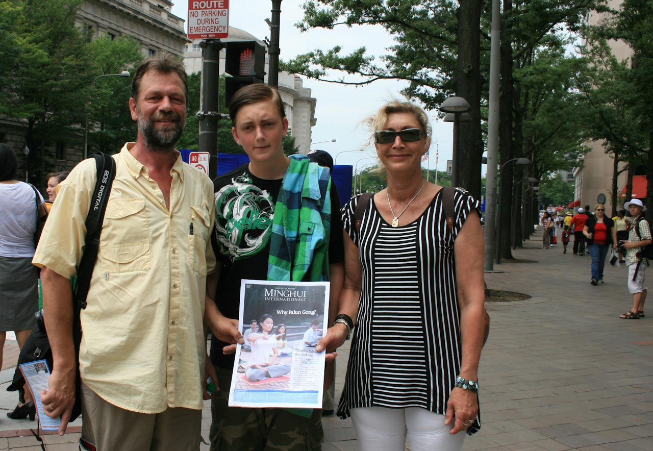到美国旅游的丹麦图片设计师拉斯(Lars)一家人,高兴地接过法轮功真相资料,“是到了中国改变的时候了,也希望这一时刻早日到来。”
