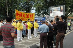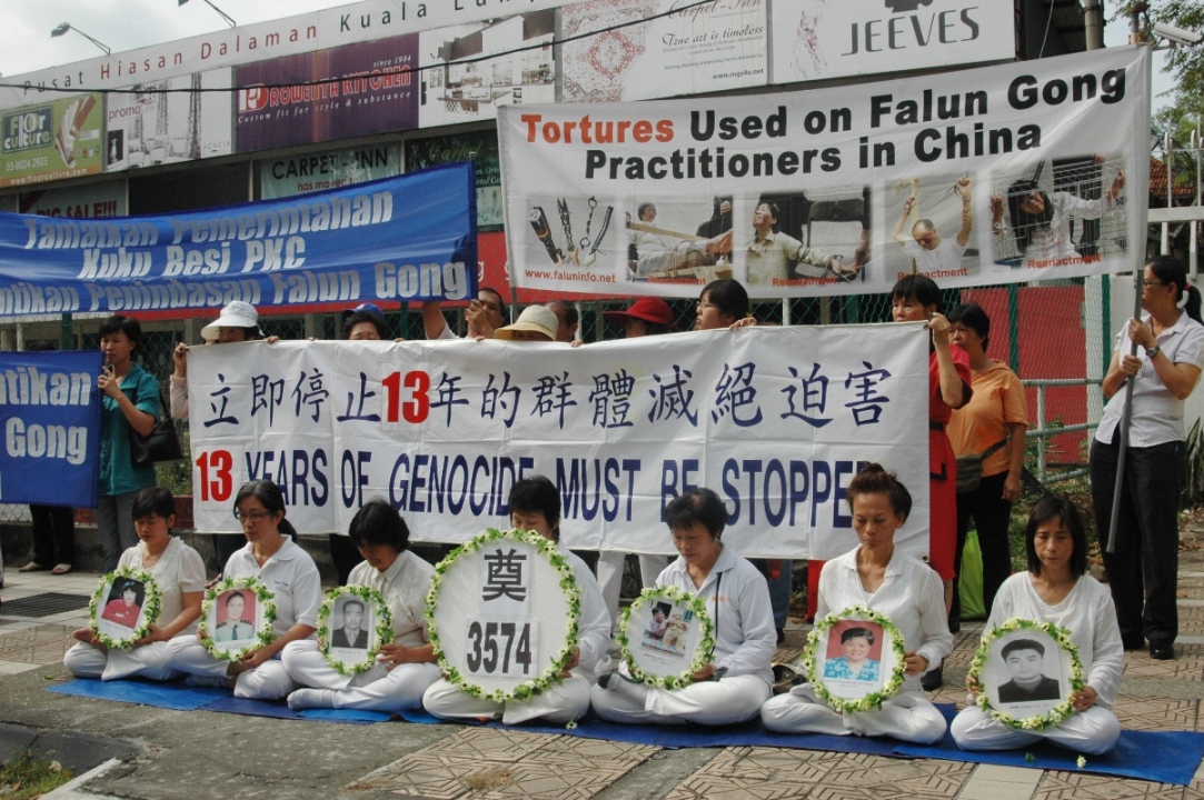 当天上午十时,马来西亚法轮功学员来到车水马龙的中共使馆前,拉起横幅,现场宣读中文和马来文告,谴责中共对法轮功长达十三年的残酷迫害。学员们同时拿着花圈静坐,悼念在中国被迫害致死的法轮功学员,庄严肃穆的场面引起人们的关注。