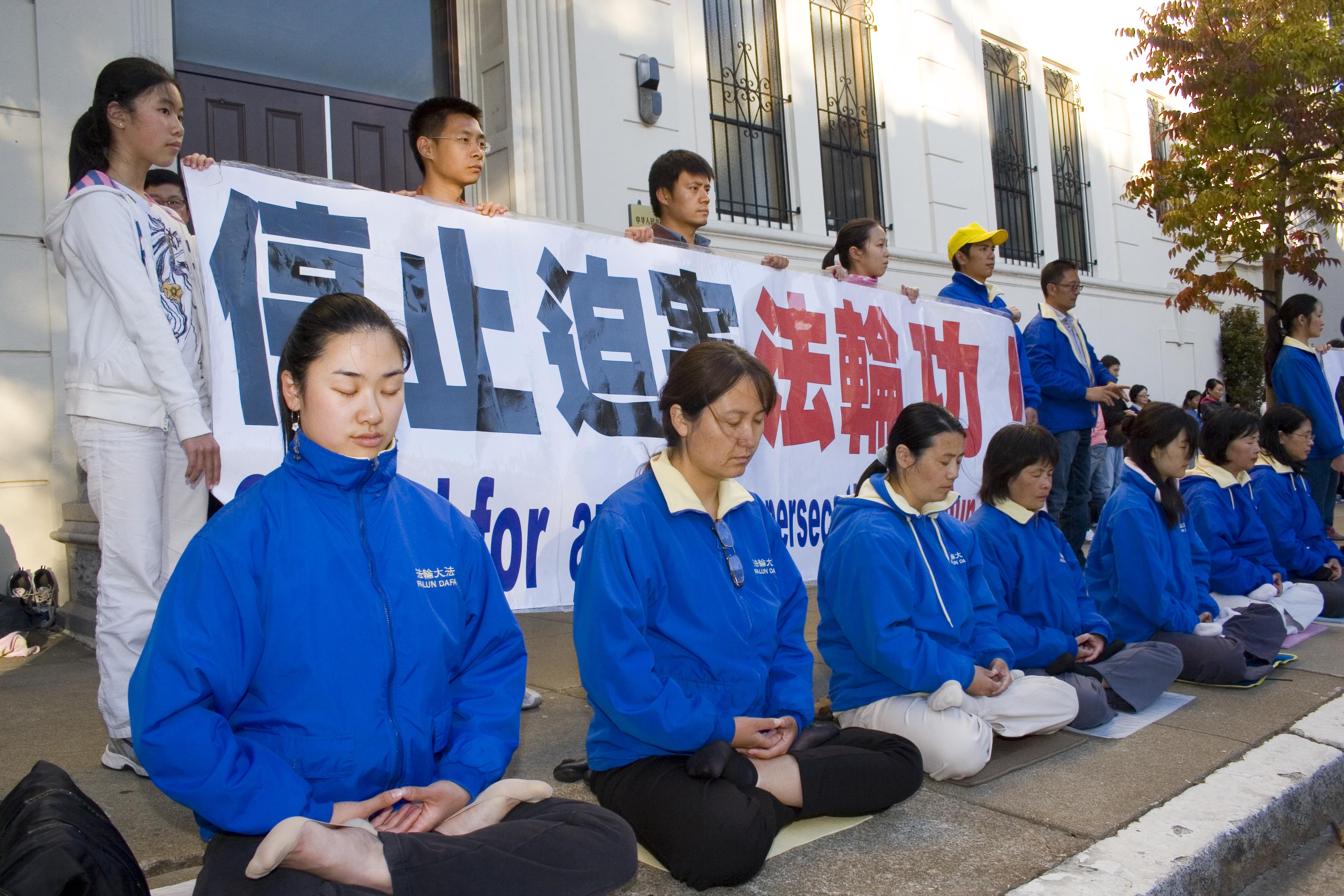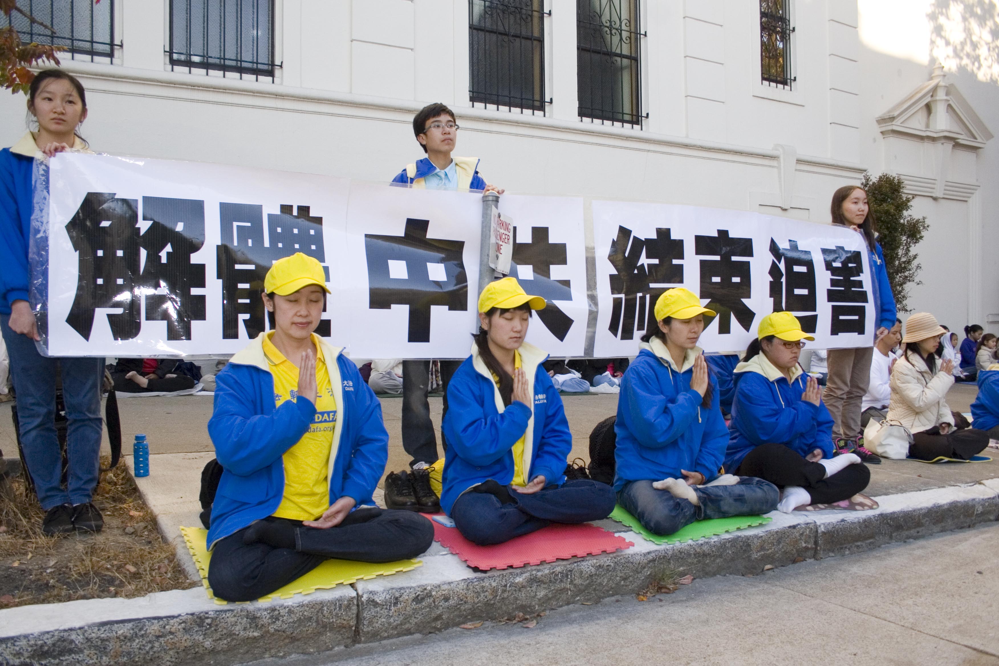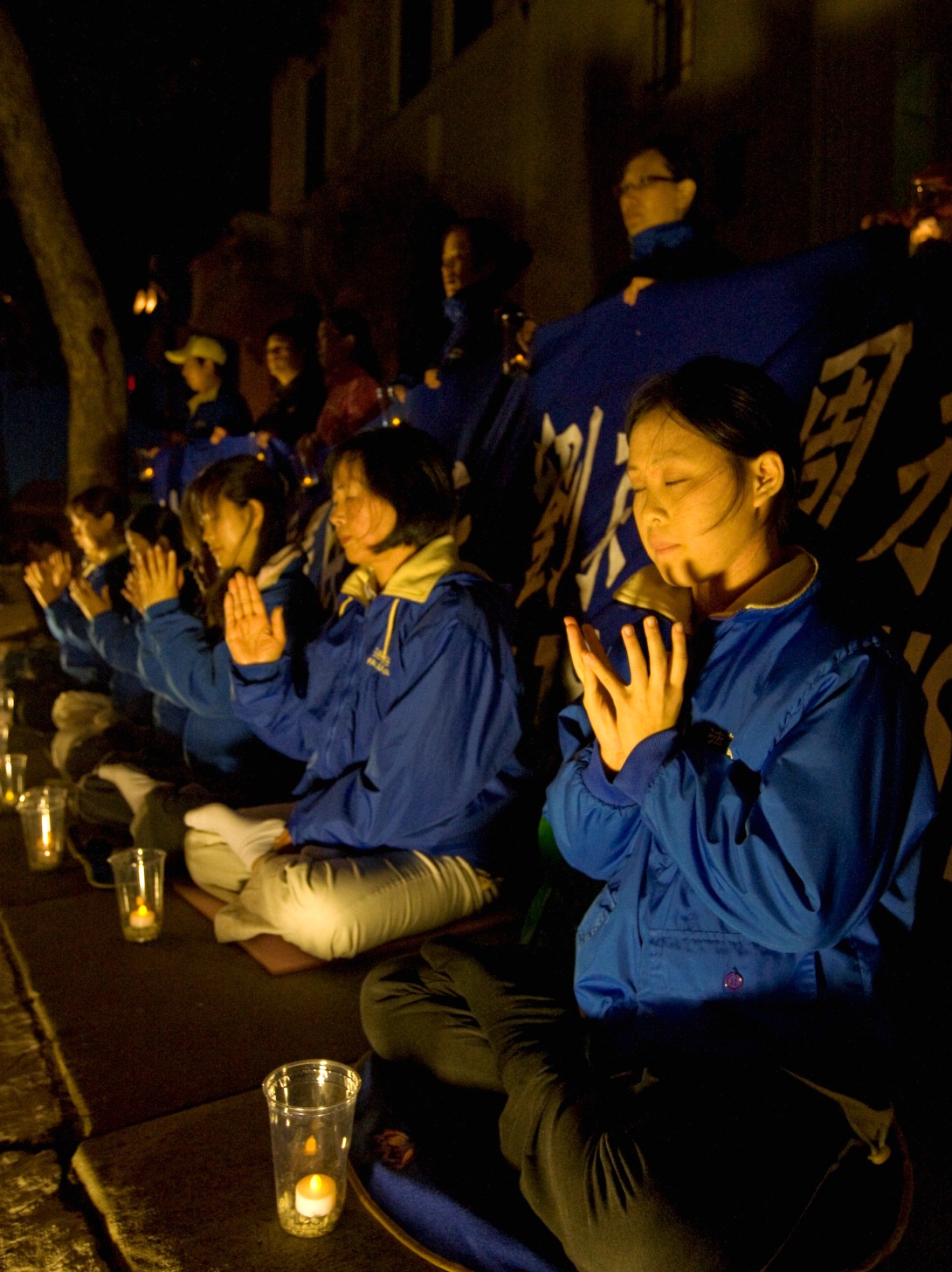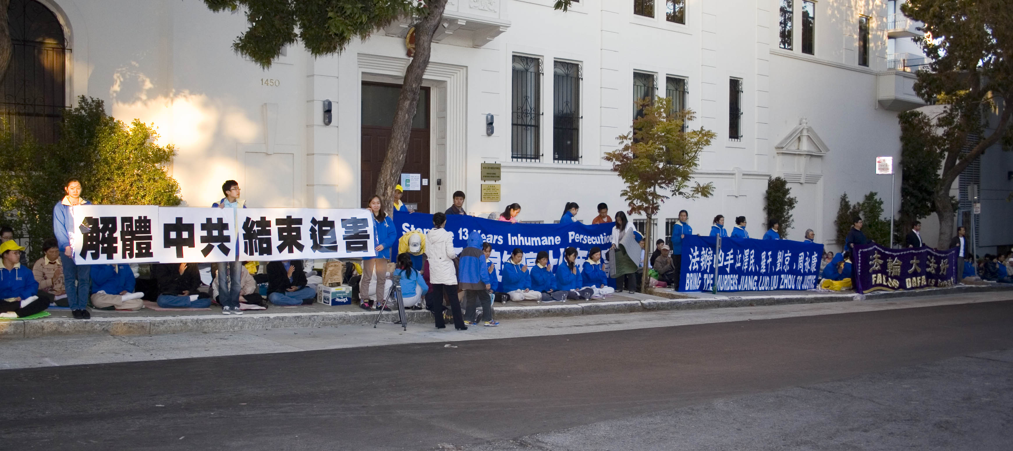 当天晚上七点,旧金山及周边地区的二百多名法轮功学员汇集在中领馆前,打出“停止迫害法轮功”、“法轮大法好”、“解体中共 结束迫害”等中、英文横幅。伴随着平静柔和的音乐,他们燃起点点烛光,悼念被中共迫害致死的中国大陆同修。主办者说,截至目前,已有至少三千五百七十四名法轮功学员被中共迫害致死。