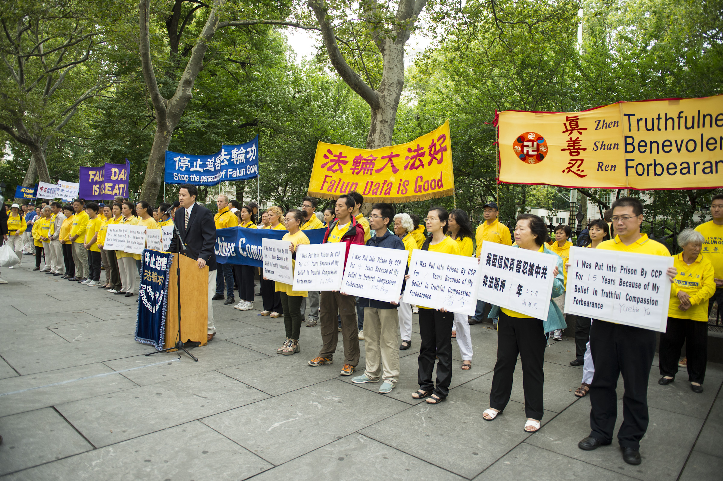 法轮功发言人张而平表示:今天法轮功学员来到这里,是为了向国际社会上的民众揭露关于中共迫害这群善良和平的法轮功修炼者的真相。十三年来,超过三千名法轮功学员被非法关押、遭受酷刑折磨,更加残忍的是,中共甚至对法轮功学员活体摘取器官。但是法轮功学员以非政治的和平方式面对这一残暴的迫害,他们重新诠释了和平与非暴力的定义,他们不畏暴政,坚持自己的真善忍信仰。在中国,平均每十三个人中就有一人修炼法轮功,试想一下,在中国的大学教授、学生、员工、或者是工人,只要信仰法轮功,就会被关进监狱或洗脑班。在今天这样一个特殊的日子里,我们要大声将真相说出,让生活在正义、民主及人权下的美国人民都看清中共当局的真面目。