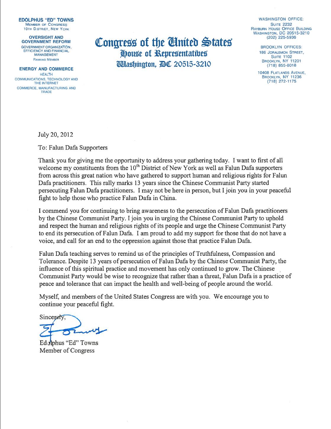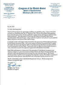 谢谢你们给我这个机会在你们的集会上发表讲话。我想首先欢迎纽约第十选区我的选民们,以及来自全国各地的支持人权和宗教信仰权利的法轮功支持者们。这次集会的举行正值中共迫害法轮大法修炼者长达十三年。虽然我本人无法出席集会,但是我加入你们的和平抗争,以帮助在中国的法轮大法修炼者。