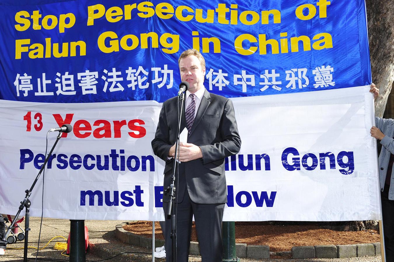 曾经到过中国的纽省议员派克尔(Jamie Parker),在集会上讲述了自己的亲身经历,他说:“我在此发言,出于个人的原因,也是出于道义原则的原因。几年前,我访问过中国,到了天安门广场,亲眼看到了残忍的迫害,那里有手拿支持法轮大法横幅的人们,我看到警察和武警攻击这些人们,殴打他们,把他们带上警车。”他认为人权应该是头等重要的,尽管贸易也很重要,但不能比人权更重要,不能比在世界人权宣言中所说的人权更重要,不能比那些坚持自己精神信仰的权利更重要。