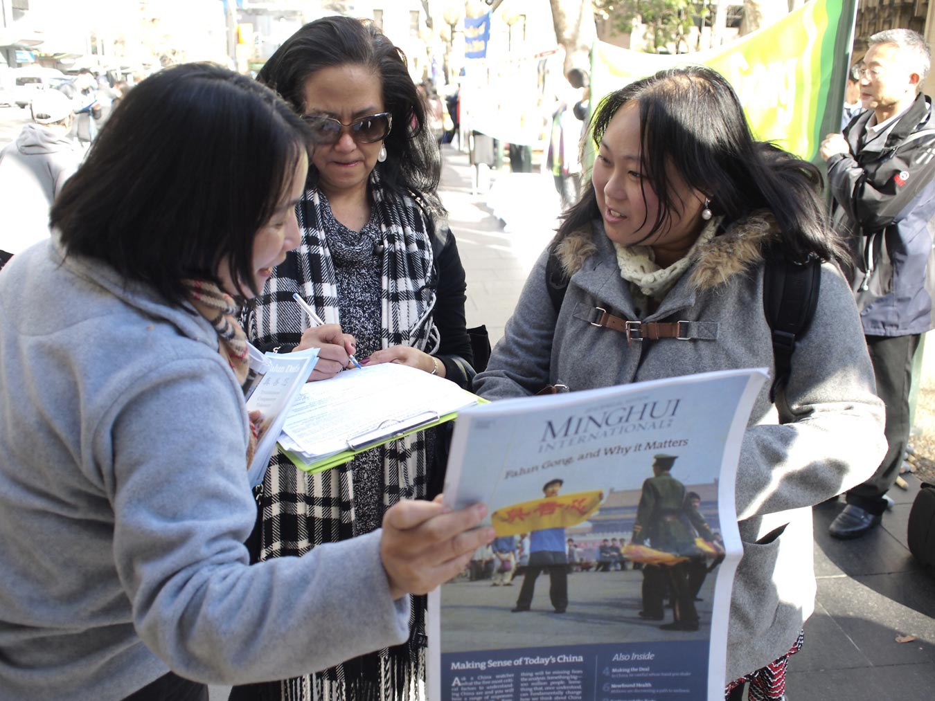 来自北京的琳达女士表示,自己一来到海外就看见法轮功学员以各种方式反迫害,她常接到学员发的真相小册子,她钦佩法轮功学员这种旷日持久的坚持,从内心觉得法轮功太了不起了。