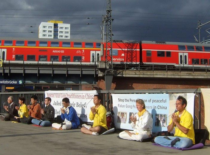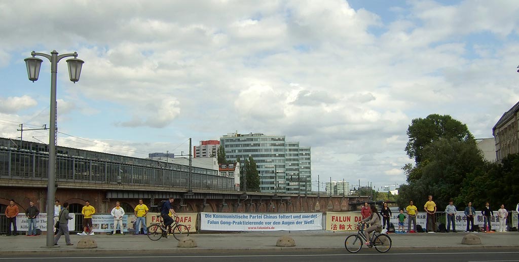 ![]() 柏林法轮功学员在中使馆前抗议。中间的横幅上写着:在世界的注视下,中共酷刑折磨和虐杀法轮功学员 |