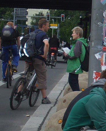 ![]() 骑车人停下车,倾听法轮功学员讲述迫害真相 |