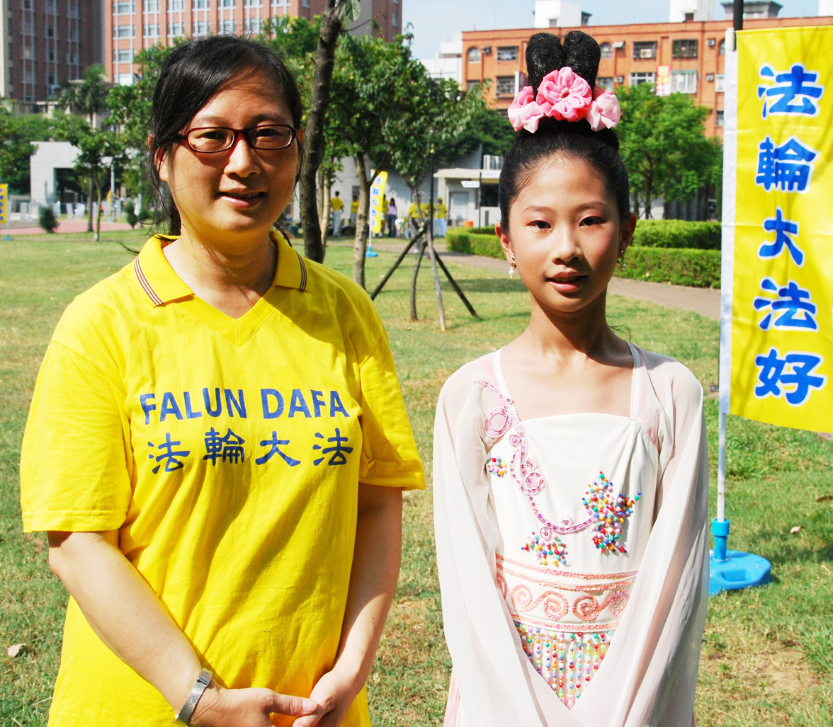 芃宣的母亲秀文很高兴能和女儿一起出来弘扬大法的美好。七年前,秀文在朋友的介绍下开始阅读《转法轮》,法轮大法“真、善、忍”的法理深深吸引着她。秀文说:“修炼后身心受益很大,尤其是心性的提升。大法的法理会随时提醒自己是一个修炼人,要收敛易怒的脾气。”七年来,秀文从不缺席“七˙二零”反迫害的活动,希望让世人知道中共的暴行。她认为,身为一个法轮功学员能弘法、讲真相是一件非常荣耀、非常高兴的事情。
