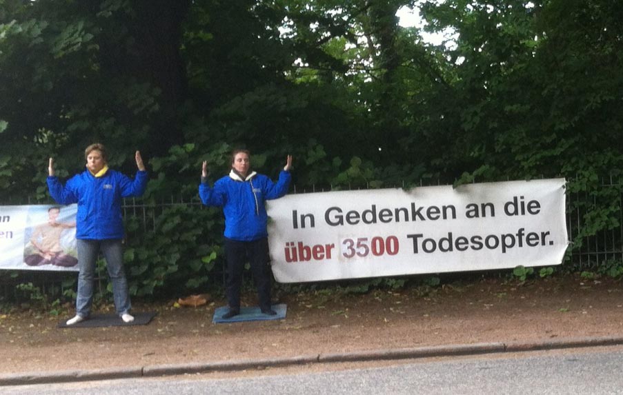 在华人经过最多的摩肯贝克(Moeckenbergstrasse)和朗莫恩(Lange Muehren)路口,法轮功学员的横幅一字排开,从左到右依次写着“法轮大法—性命双修之路 五套功法三字真言”,“从1999年7月20日开始,3500人死亡,10多万人被劳教,无数人流离失所”,“死亡营遍布中国大陆,受害者是法轮功学员”。模拟活摘器官的手术台和身穿白大褂,双手沾满鲜血的“医生”则马上引起路人的注意。不同种族和信仰的人们在惊诧中不由停下了脚步,聆听有关中共活摘法轮功学员器官的广播。