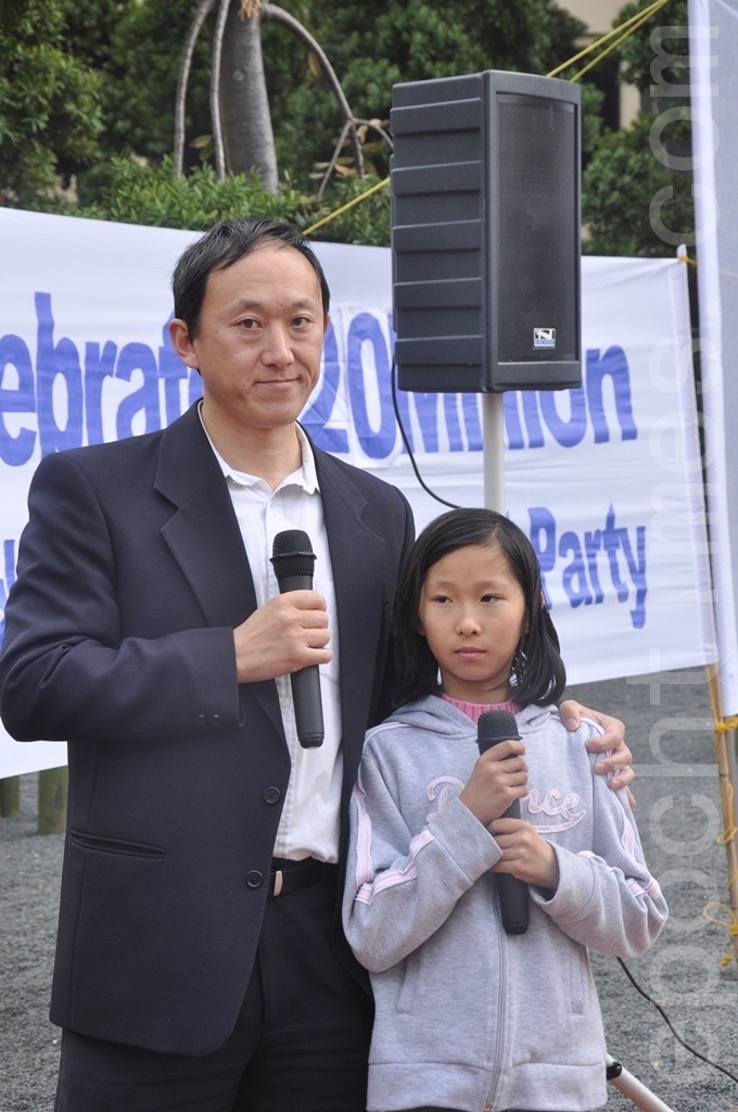 著名人权律师Kerry Gore与多名法轮功学员也在集会现场发言。最令人难忘的是十一岁的小开心。她从十八个月大还没记事起,妈妈就因为修炼法轮功被中共迫害致死。在她的记忆中从来没有妈妈的印象。每当看到有其他小朋友抱在妈妈的怀中,她都会伤心难过。她说:“我想妈妈”普普通通的一句话,听者却无不动容。