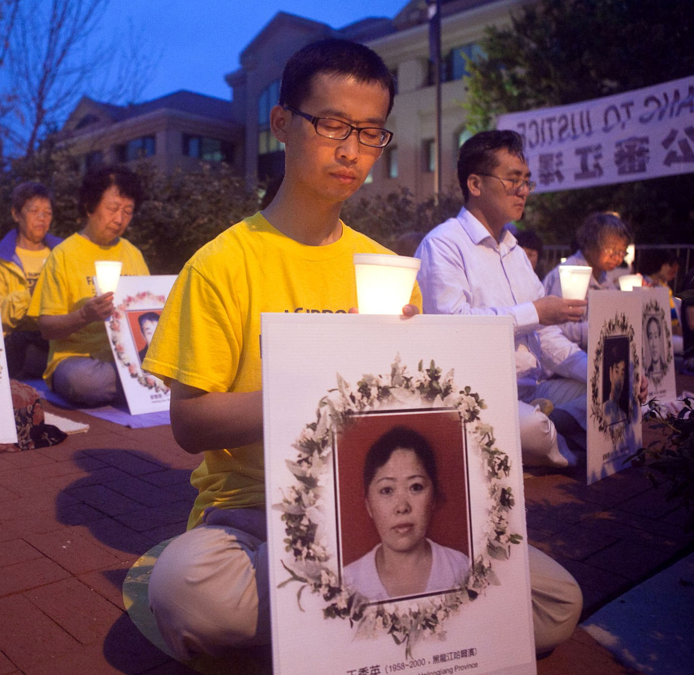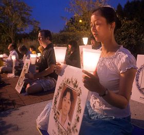 几个月前刚刚从中国大陆辗转来到美国的王女士,在国内曾经因修炼法轮功而被非法关押三年半,她现在虽然可以在这里自由的炼功,讲真相,但还心系着国内的法轮功学员。她说在国内时身边的几位学员被迫害致死,烛光守夜中学员们所持的被迫害致死的法轮功学员照片中就有一位是她在国内同一个资料点的好友。她说:“这场迫害早就应该结束了。这么正、这么好的大法被这样迫害,真是千古奇冤。”