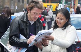 还有两位西方女士一起走过讲真相展板时,其中一位主动告诉另一位女伴她所了解的关于法轮功的真相。有个西方男士听了法轮功被迫害真相后,尽管他认为这事离他太遥远,但是他还是认为人们应该互相帮助,制止邪恶。另一位西人女孩在一位法轮功学员那儿听闻真相后,不但签了征签信还去路过的另两个征签点签名支持。