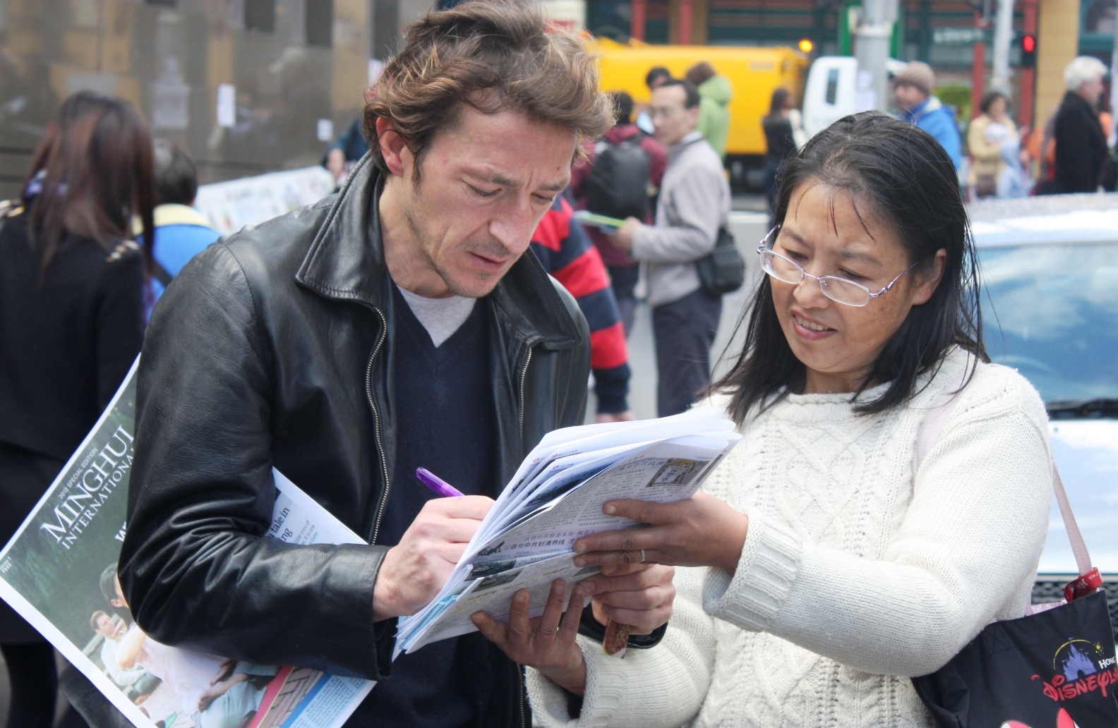 “今天我站在悉尼的唐人街,看到很多的中国人不知道中共不但对法轮功修炼者在精神和肉体上的迫害,还活摘他们的肝、肾等器官去赚钱。当我告诉中国人时,很多人很震惊,他们好象不太相信这个事实。我很为这些中国同胞难过。法轮功学员这么多年来这么坚持为什么?他们明知道他们这么走出来讲一句真话就会失去工作,甚至生命,他们知道做这一切的后果,他们为什么一直这样走出来为广大老百姓讲清这个真相呢?”