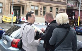 悉尼学员捷德告诉记者:“在反迫害十三年之际,我和悉尼法轮大法修炼者一起来到悉尼市中心摆展板、拉横幅、讲真相,就是为了让世人知道真相,赶快退出中共,不要和中共一块迫害法轮功。十三年前,中共开始迫害法轮功。那年七月二十日,我也正好赶去上访。当时因为我去得稍微晚了一点,看到了中国大陆的警察把上访的法轮功弟子全部都抓起来带走了。当时马路上只有我一个行人在走路,而看到警察有整个的一大排在那儿。我从府右街走到西四那边,路上竟没有一个行人。走近信访办时,我看见那边还有几辆大客车在抓人。当时我亲自目睹了中共对法轮功开始迫害的一幕。”