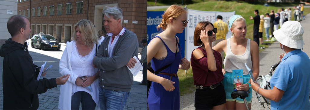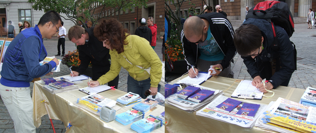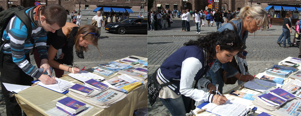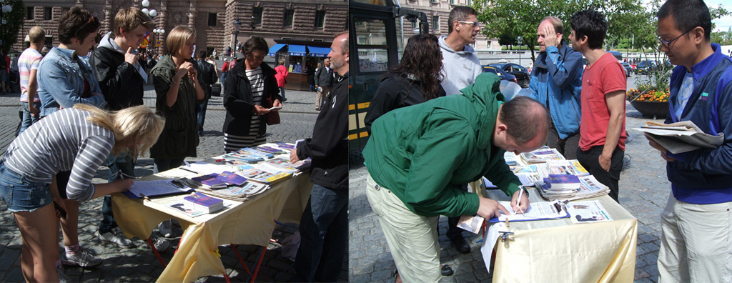 有很多人了解了真相后都主动提出要支持法轮功学员反迫害,有的提出要转告瑞典首相和政府官员,督促他们对中国这种糟糕的人权状况发声。一位端庄、大方的瑞典女士了解了真相后,主动上前签名反迫害,然后她又去催促她的男友来签名。一位大胡子老人签完名后,就在一旁耐心地等他的太太阅读展板了解真相。有三位明真相的瑞典女孩,和学员一起炼功并合影留念以表示支持法轮功。