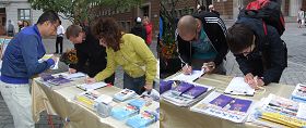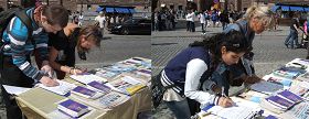 七月二十二日最后一天,下午四点活动结束的时候,有两位来自法国的游客急匆匆的赶过来,那位男士对学员说“对不起!刚才我们着急离开我还没签名哪!能帮帮我吗?”当他在反迫害的签名簿上签上名后才满意的离开。