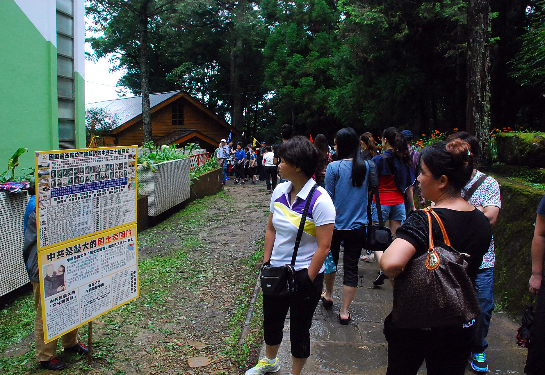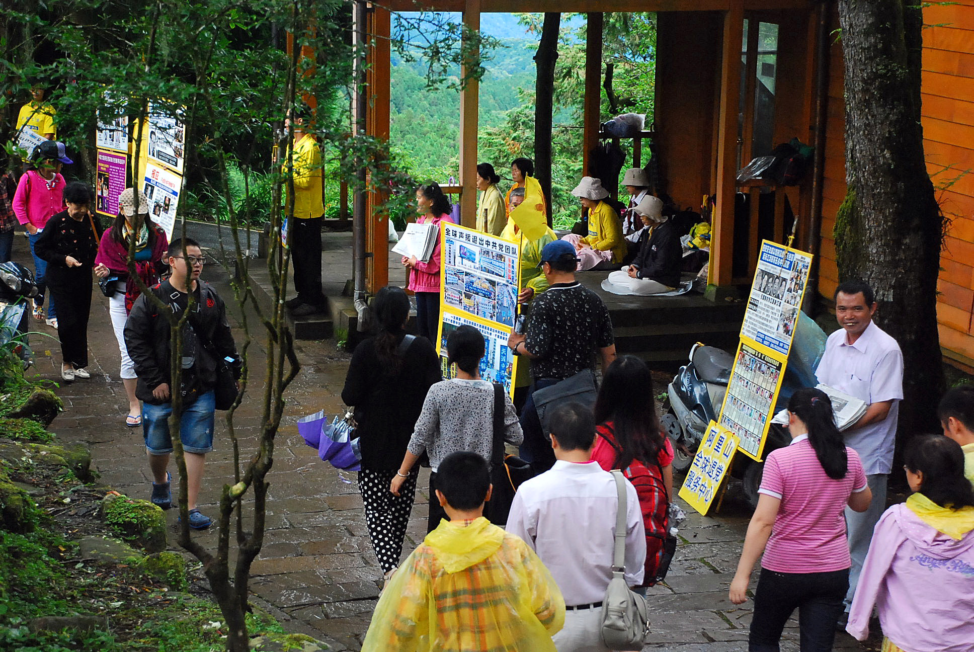 七月廿二日,一百多位法轮功学员带着资料、横幅、看板到阿里山讲真相,广传大法。在火车站、神木区、木兰园几个景点,他们拉着横幅,胸前挂着看板。横幅、看板上写着“法轮大法好”、“制止中共迫害法轮功”、“中共应立即释放法轮功学员钟鼎邦”及揭露中共迫害的事实等内容。学员们苦口婆心,不停地向大陆游客讲迫害真相、讲大法的美好,劝导他们退出共产党相关组织。