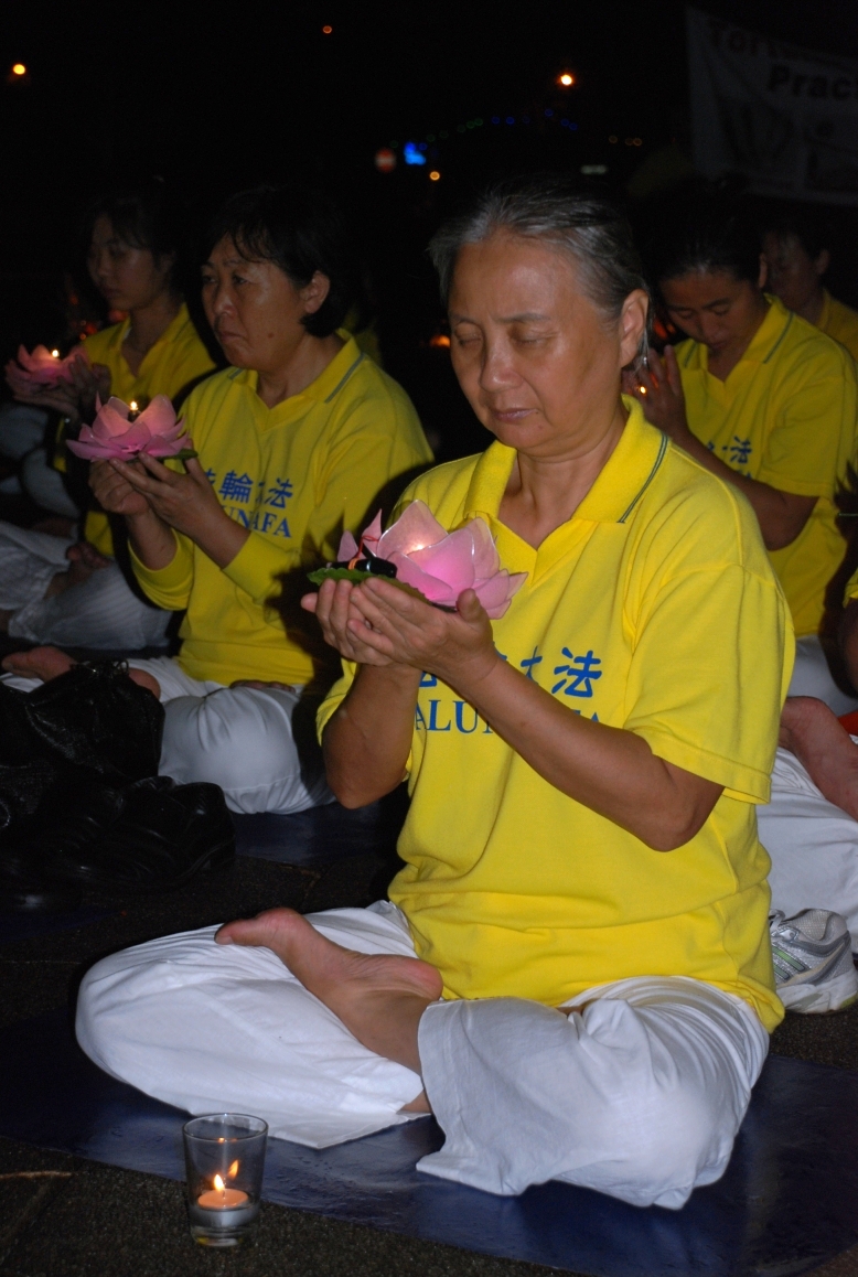 日落时分,天空下着小雨,上百名法轮功学员庄严的静坐在公园湖畔,悼念在中国大陆被迫害致死的法轮功学员。