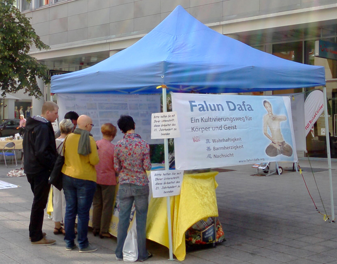 法轮功学员的信息台悬挂的揭露中共迫害及介绍法轮功洪传世界的图片、文字吸引了过往的行人驻足观看,很多人询问详细的信息并签名支持法轮功学员反迫害。
