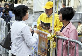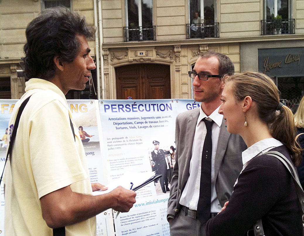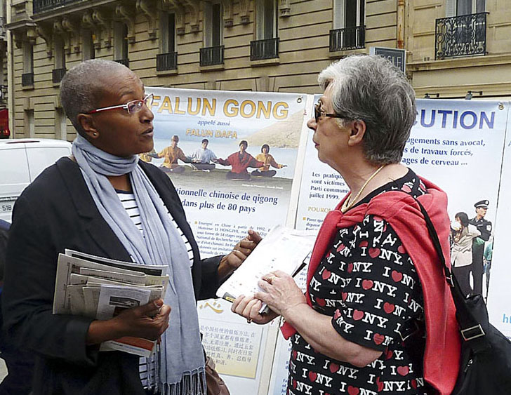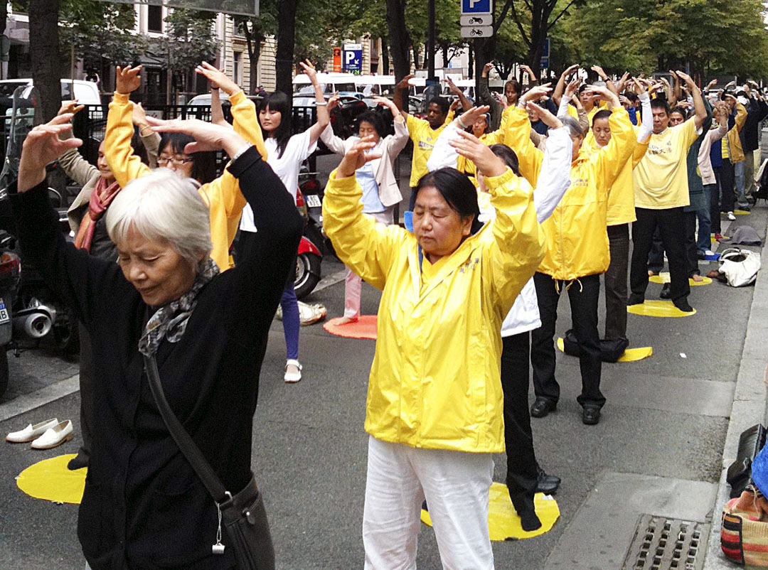 法轮功学员们在集会地点集体炼功,祥和的功法与展板上揭露的中共对法轮功学员残酷迫害形成鲜明对比,孰善孰恶一目了然。许多过往的法国民众纷纷想要了解法轮功真相,认真听取学员们的讲解。