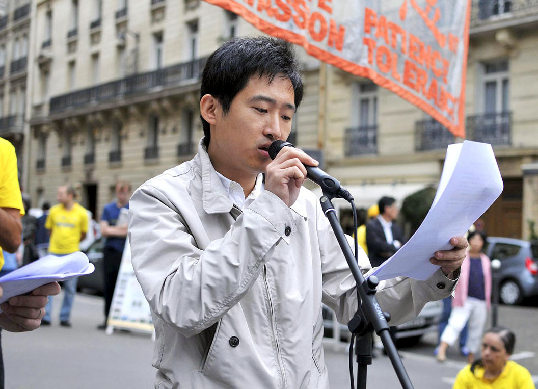 ![]() 法国法轮大法学会主席唐汉龙先生在集会上演讲 |