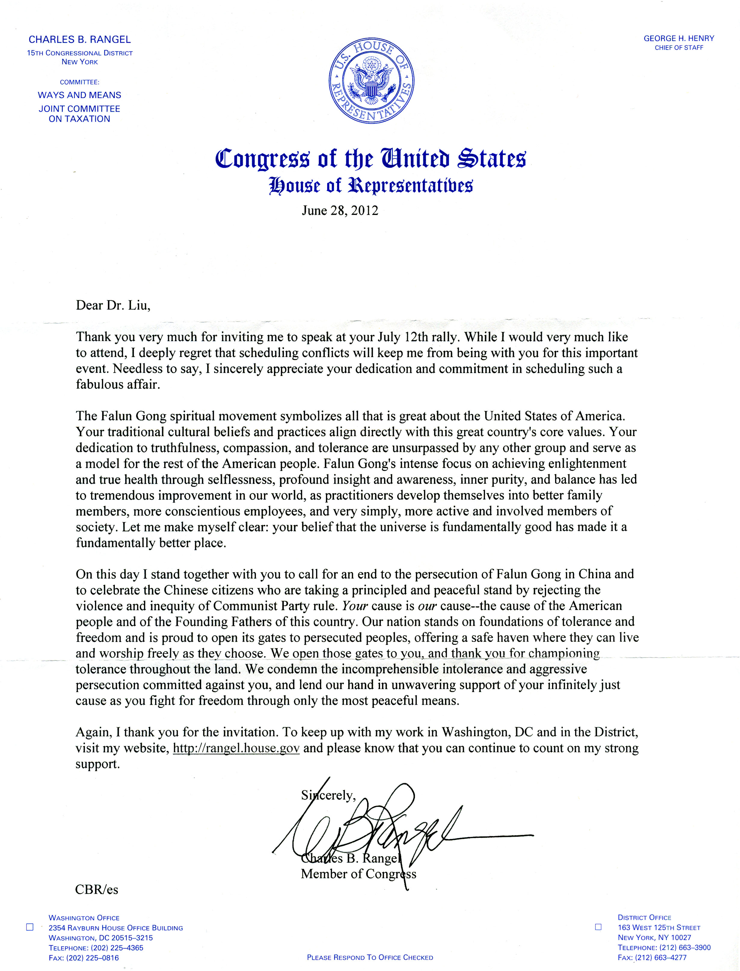 再一次,我感谢你们的邀请。你们可在我的网站https://rangel.house.gov/了解我在华盛顿特区及选区的工作。并请相信你们能一如既往地信赖我的大力支持。