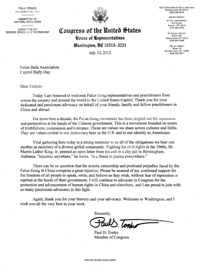 以下是唐考(Paul Tonko)声援法轮功“七二零”反迫害活动的译文: