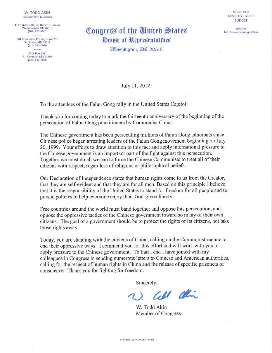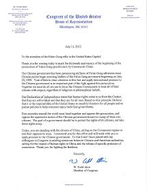 今天,你们和中国人民站在一起,呼吁中共当局立即停止它们对法轮功的镇压。你们的努力值得赞赏,我也会和你们一起让中共感到来自国际社会的压力。和美国很多其他官员一样,我曾给中共和美国政府写过多封信件,呼吁他们能够尊重中国的人权,并且释放所有的良心犯。感谢你们为自由做出的一切奋斗。”