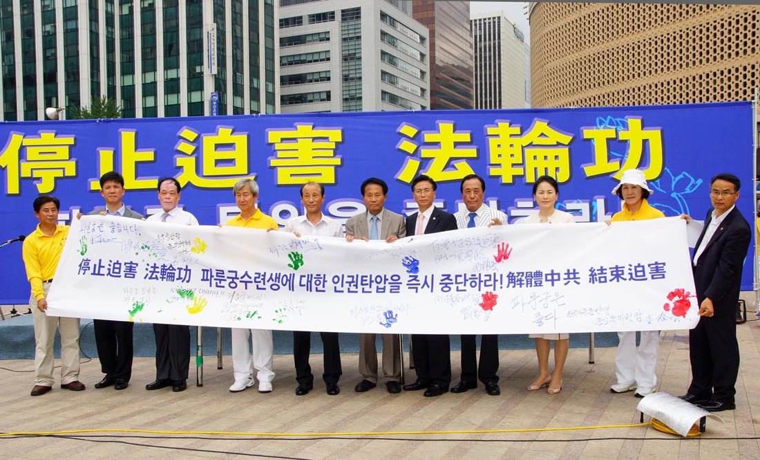 ![]() 首尔广场反迫害联合集会上,各界代表在反迫害征签大横幅上按手印并签名谴责中共对法轮功的迫害 |