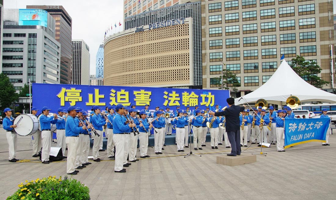 下午,法轮功学员在首尔广场的舞台上举办音乐会,表演节目中,有天国乐团团长全永佑的萨克斯演奏、四人组乐队演奏、女高音独唱、天国乐团演奏等。