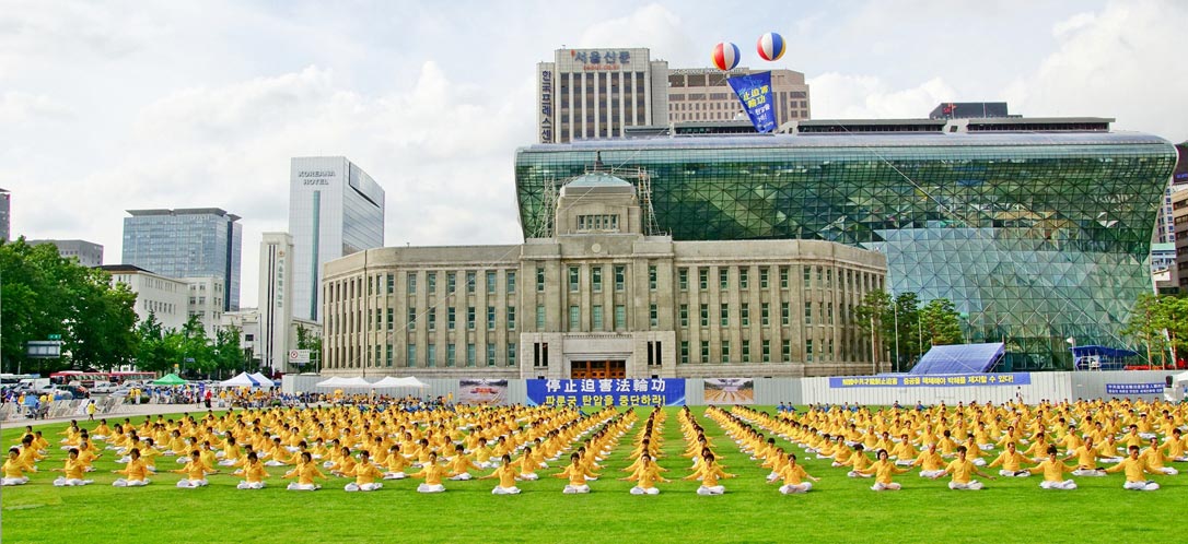 ![]() 韩国法轮功学员集体炼功,吸引行人驻足观看 |