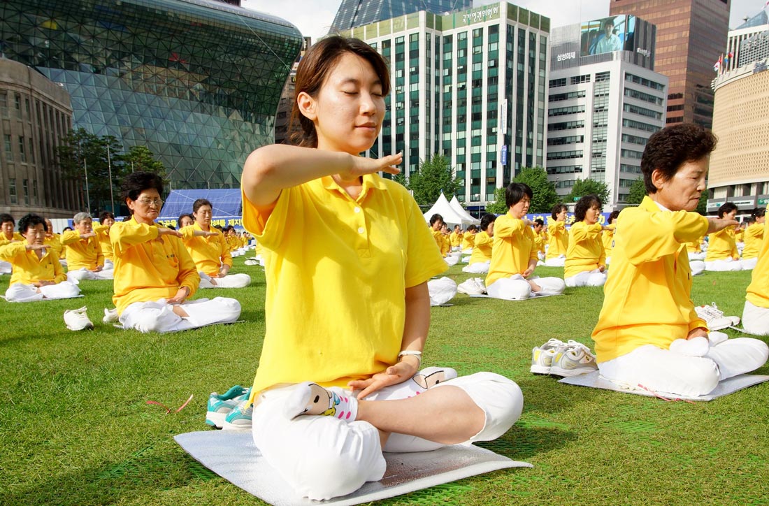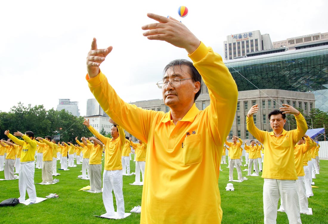 ![]() 法轮功缓慢圆的五套功法,简单易学适合各年龄层的人学炼。图为首尔广场前绿色的草坪上法轮功学员炼功身影。 |