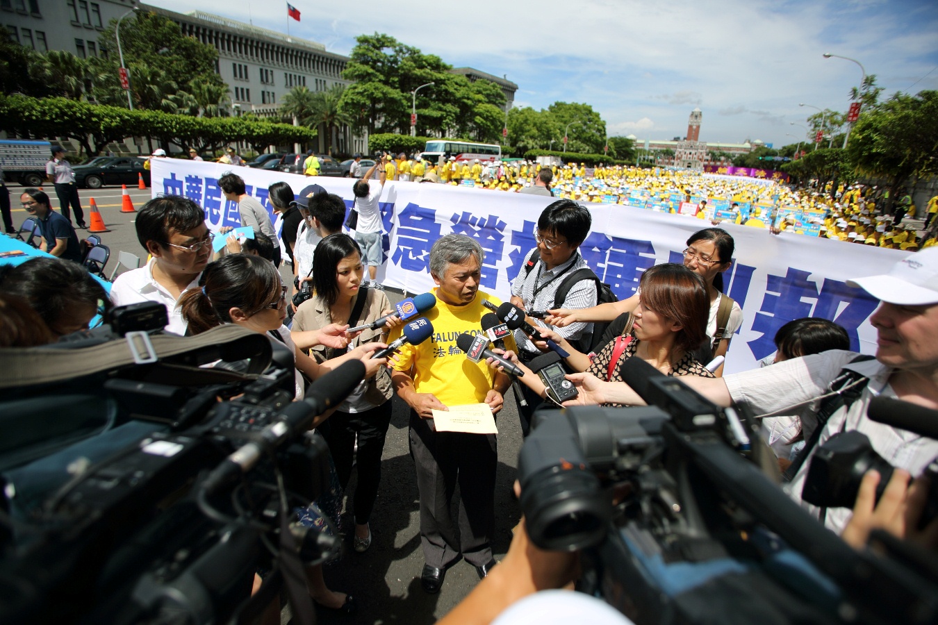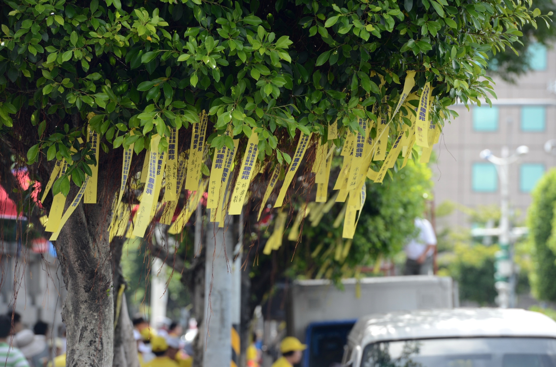 烈日下,总统府前凯达格兰大道的行道树上,飘扬着祈求钟鼎邦平安归来的黄丝带。除了钟鼎邦家属、法轮功学员外,还有民间司法改革基金会、台湾关怀中国人权联盟、人本教育基金会、台湾图博之友会、台湾投资中国受害者协会等五大民间社团和立委黄文玲等都加入声援释放钟鼎邦的行列。