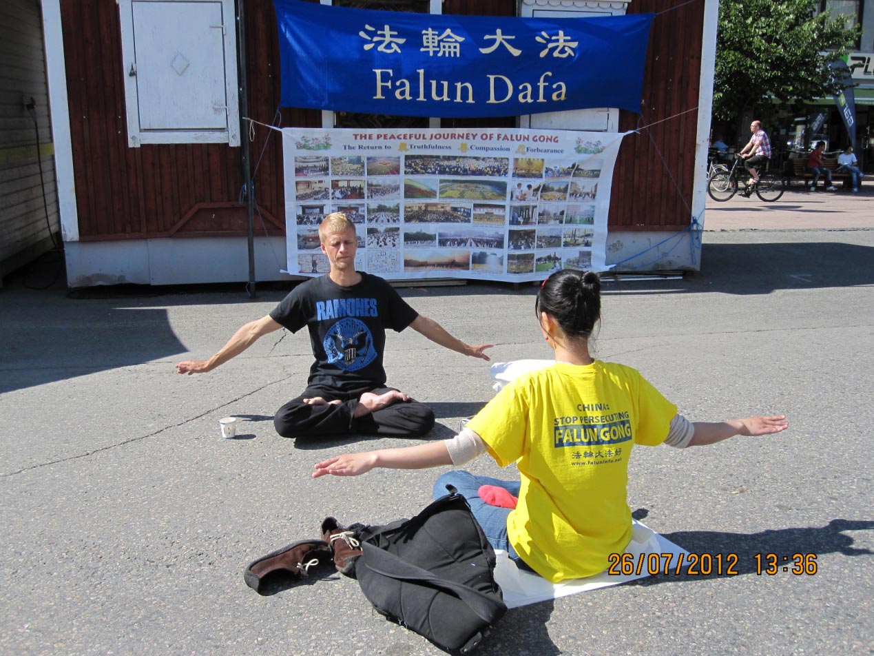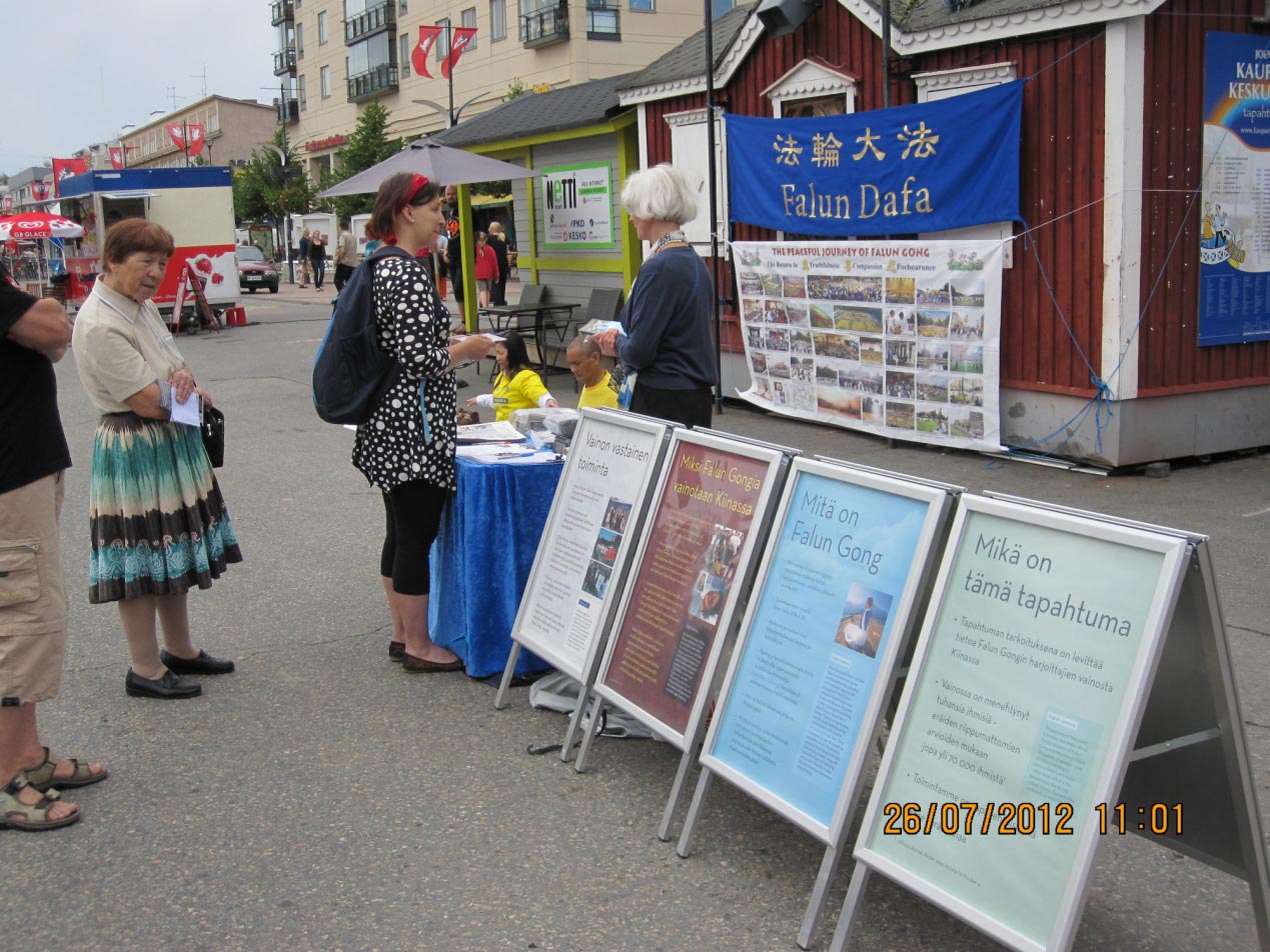 一对芬兰中年夫妇了解了法轮功学员从首都赫尔辛基几百公里外来到该城市告诉他们真相,非常感动。他们了解到法轮功遭到中共残酷迫害十三载后,主动签名支持法轮功学员。有多位民众拿了真相资料后匆匆离开,但过了一段时间他们又回来告知学员:他们已经了解真相,并在支持反迫害征签簿上签名。