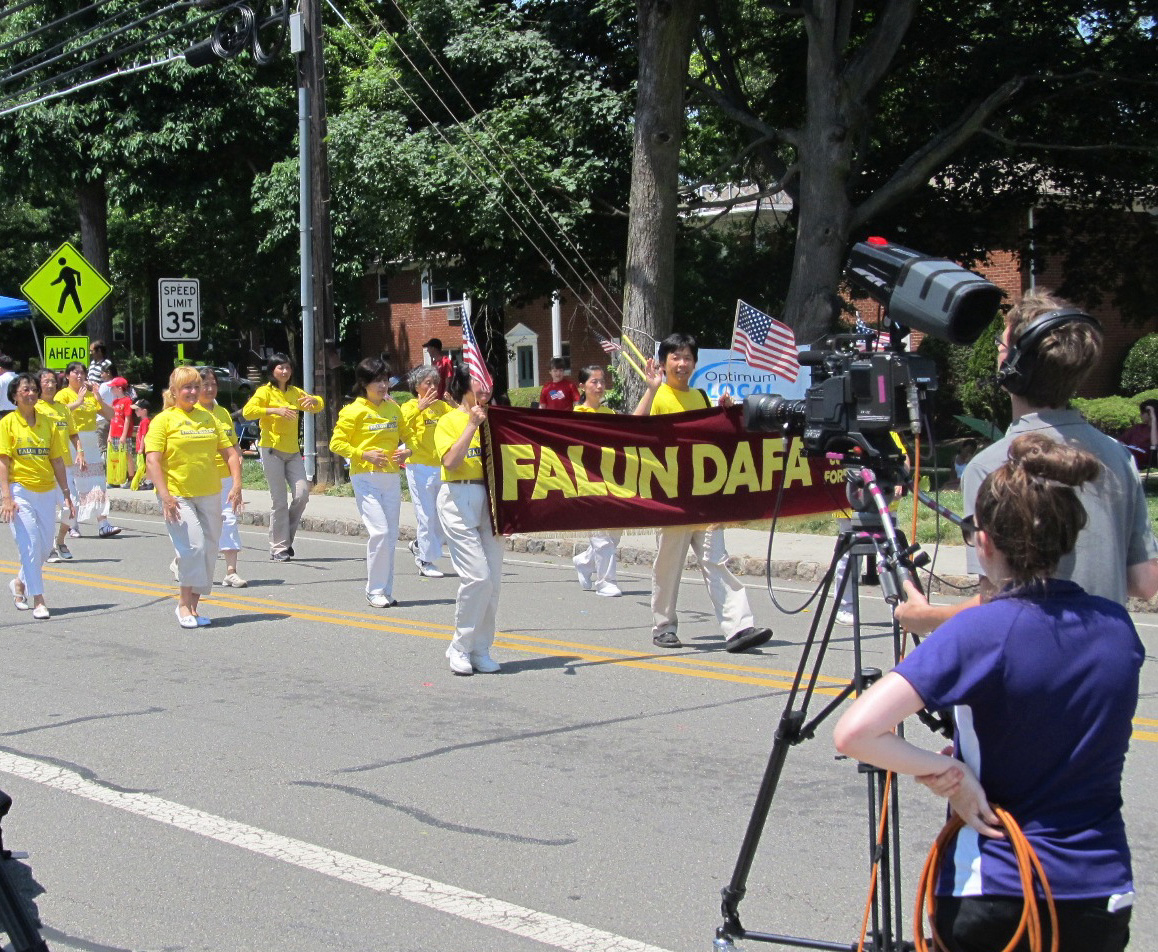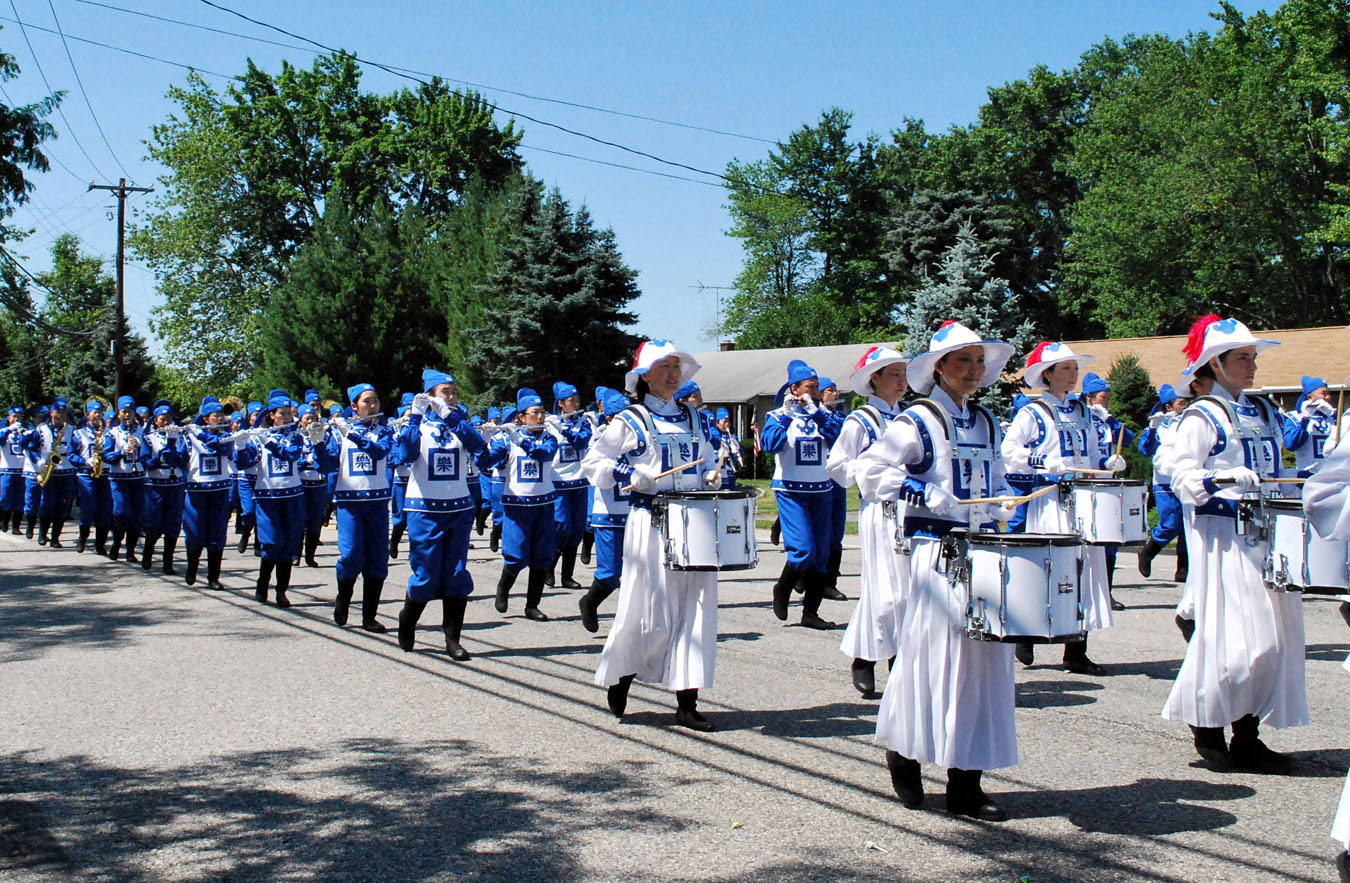 二零一二年六月三十日,上午,新泽西孟维尔市(Montville)大型的独立日游行在艳阳下火热展开。彩车、气球、乐队、勾勒出一幅欢腾的景象。众多当地居民举家在沿途的路边观看。由大纽约地区部份法轮功学员组成的天国乐团作为游行中最庞大的一个华裔团队,同时也是规模最大的军乐队,受到民众的瞩目。乐队成员身穿各式唐朝乐官服饰,一边行进一边演奏《法轮大法好》、《法鼓法号震十方》、《法正乾坤》等曲目,为民众送去吉祥与幸福。