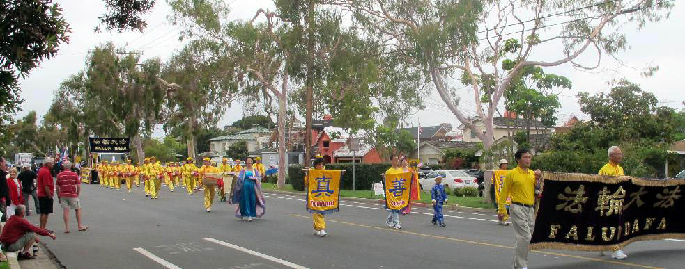 在将近两个小时的游行过程中,法轮大法游行队伍的出现,给成千上万的观众带来了惊喜、激动和欢乐。在一浪接一浪的掌声和欢呼声中,有的观众还情不自禁地跟着学习炼功动作,有的跟着鼓点起舞,还有美国观众用中文喊“法轮大法好”。还有很多民众对着法轮大法的游行队伍拍照、合影、摄像,以记录下这美好的瞬间。