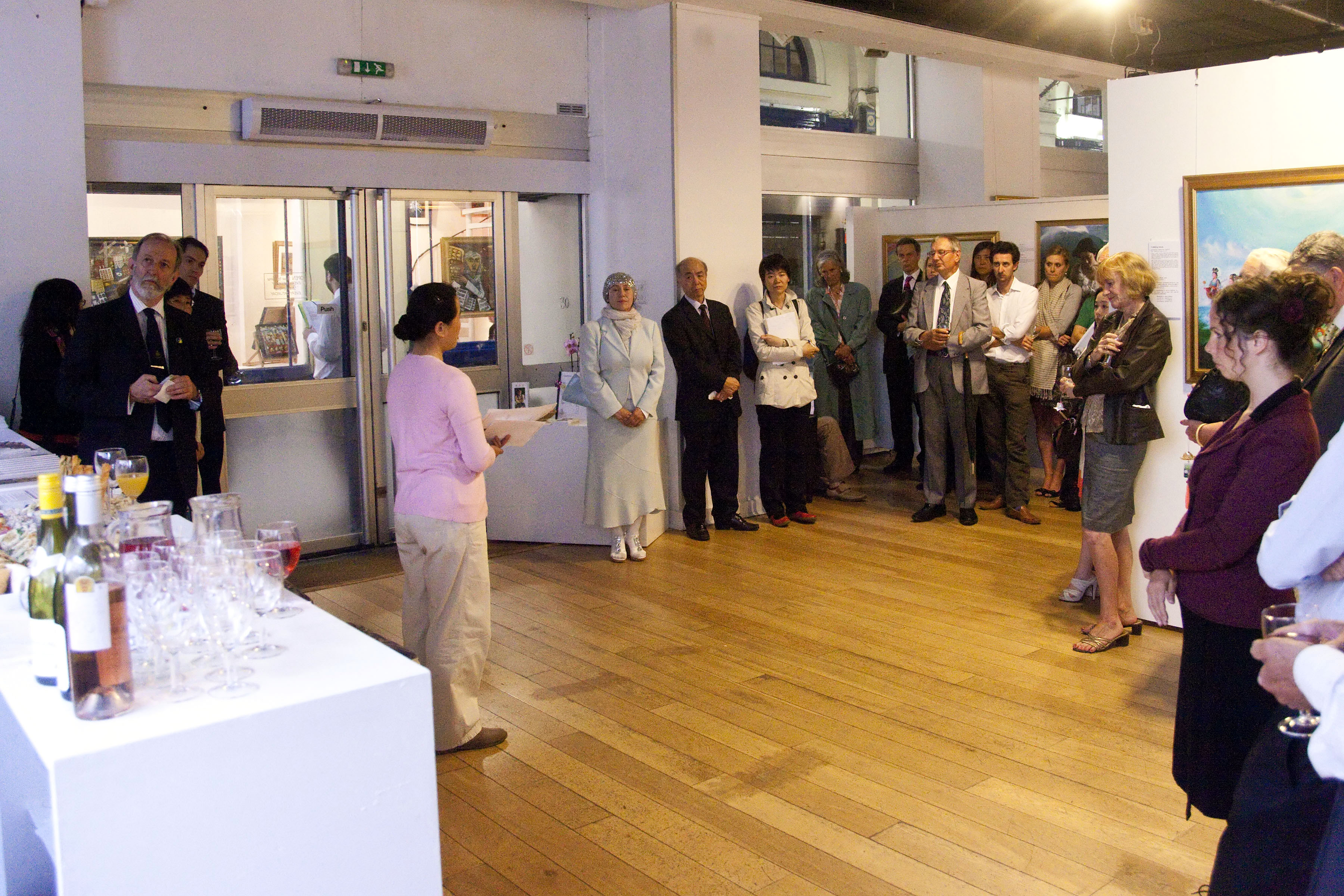 在开幕仪式上,画展主办方邀请法轮功学员安妮结合自己亲身经历为观众讲述法轮功在中国无辜遭受的残酷迫害,并播放了创作这些美展作品的艺术家的一个宣传短片。