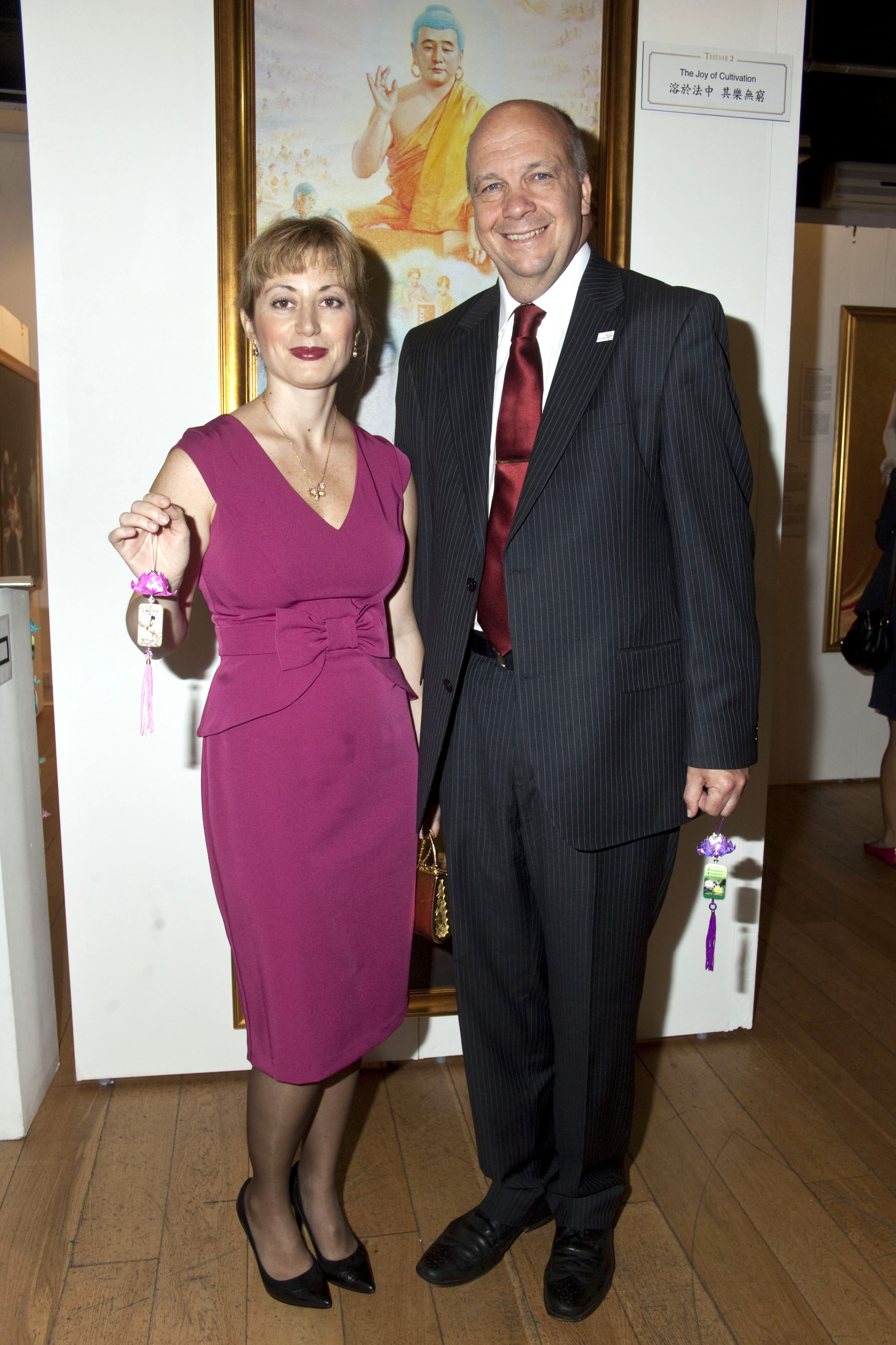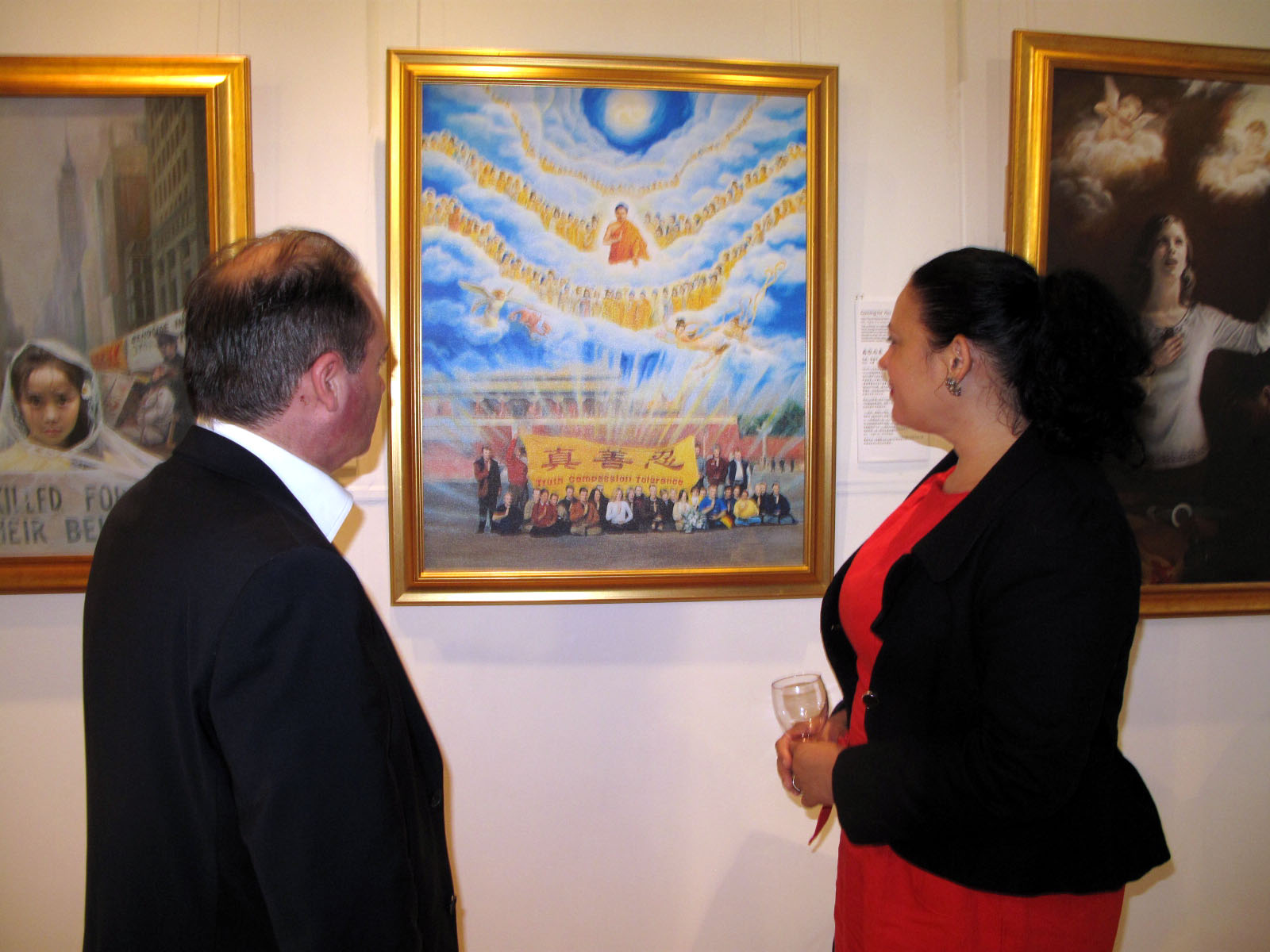 伦敦哈佛林区的工党领袖迈克尔•怀特(Leader of LB Borough of Havering Michael White)先生和女伴嘉妮娜(Janina Nowackar)长时间地认真欣赏每一幅作品,仔细地品味画作带给他们的震惊、震撼以及对生命的重新体悟,法轮功学员安妮的故事更是让二人深受触动。