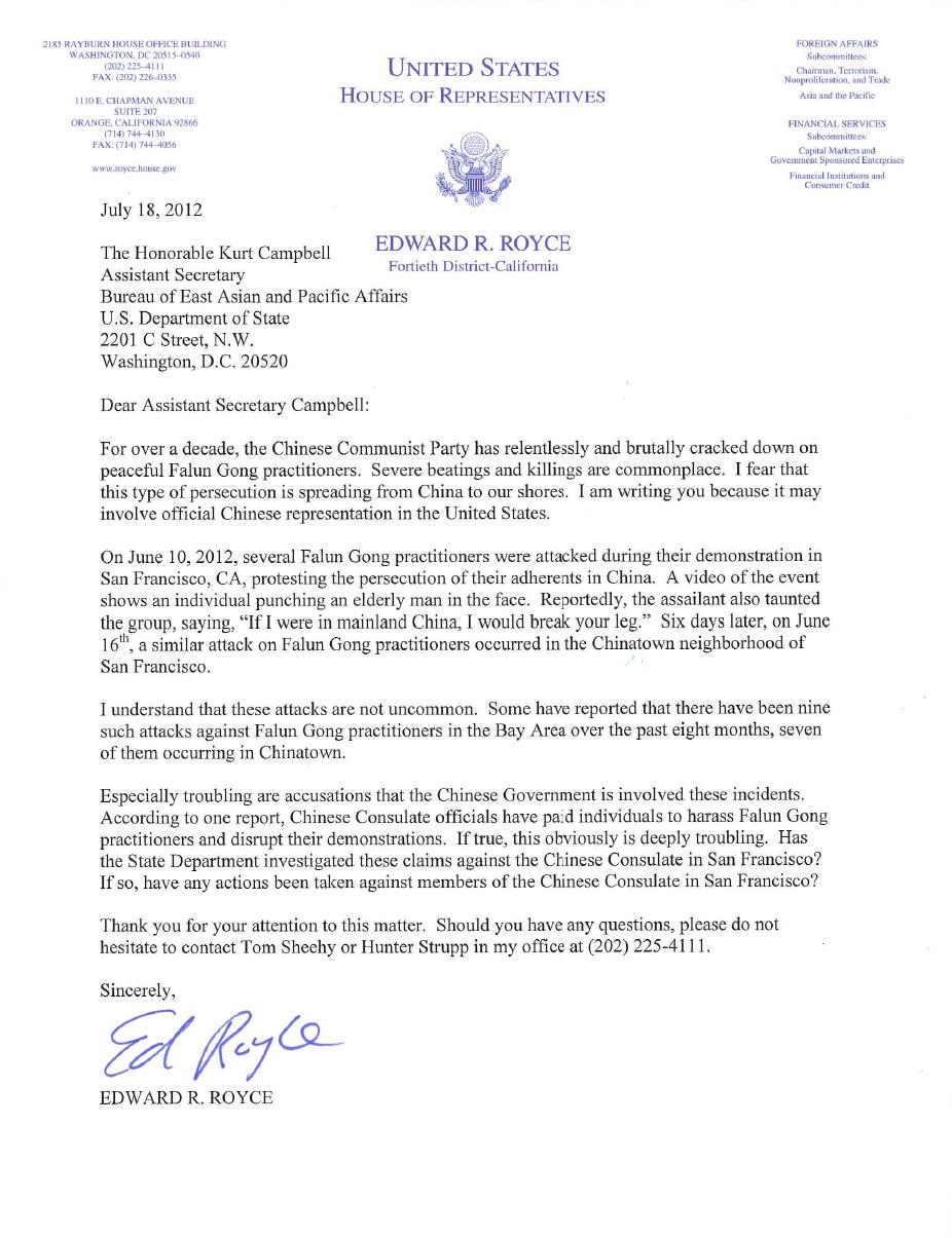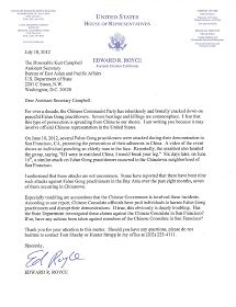 特别令人不安的是,据说中国政府卷入了这些事件。根据一个报导,中领馆官员曾经付钱给一些人去骚扰法轮功学员、干扰他们的抗议活动。如果是真的,显然令人深感焦虑。国务院有在调查这些对旧金山中领馆的指控吗?如果有,对旧金山中领馆人员采取任何行动了吗?