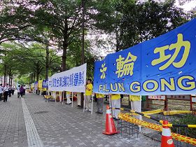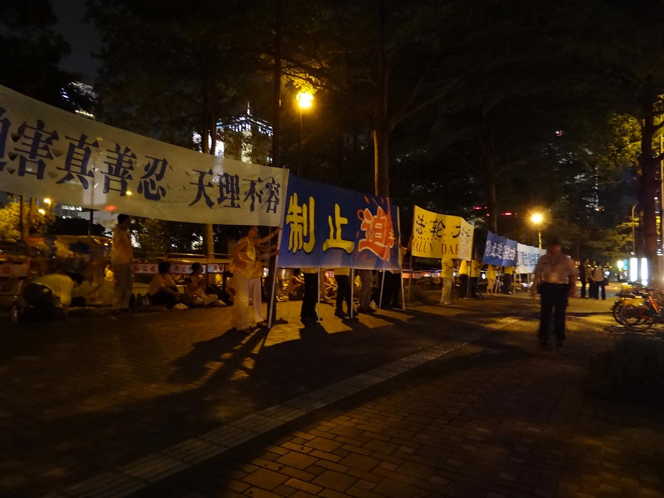 从白天到黑夜,再到日出,尽管这几天,台北天气不太稳定,不过持续守候在现场的法轮功学员,已经展现了他们对信仰的坚持。