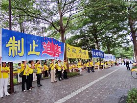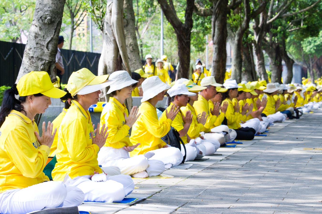 八日傍晚,君悦饭店的对面,法轮功学员拉起“法轮大法好、停止迫害法轮功、中共应立即释放台湾法轮功学员钟鼎邦”等横幅。越晚聚集的学员越多,他们下了班后陆续赶过来。学员中有公务员、律师、会计师、资讯工程师、大学教授、高中及国中教师、自己做生意的老板、大学生、高中生、国中生及小学生等等,法轮功学员涵盖各阶层各行业的人,都在法轮大法修炼中受益。