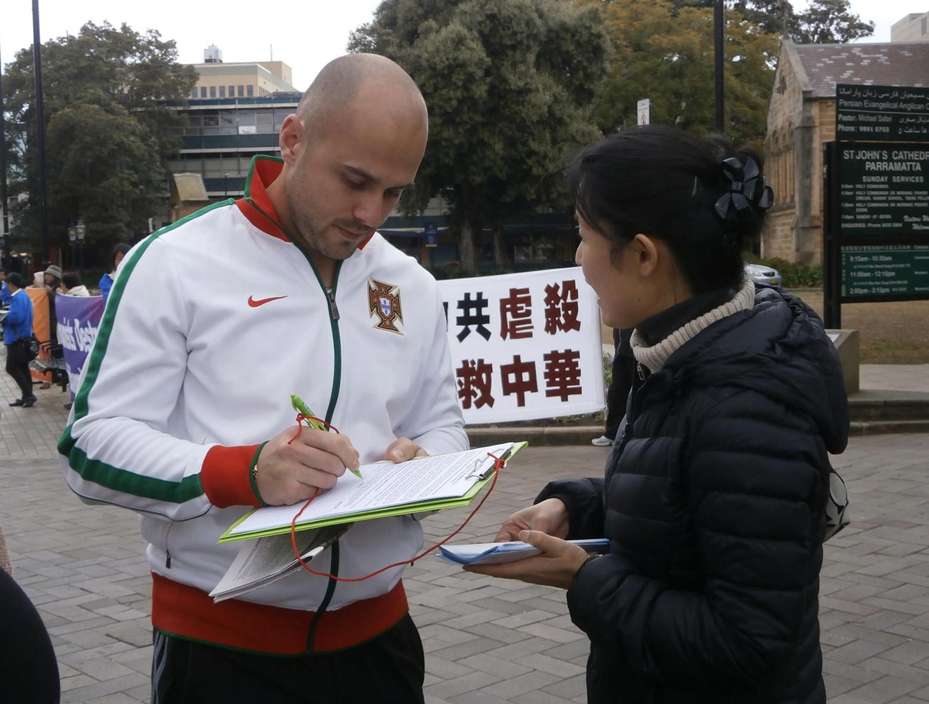 一位从南非来的西人说自己在南非就听说过法轮功被中共迫害的情况,他完全支持法轮功学员坚守“真、善、忍”的信仰,并签名声援制止迫害法轮功。