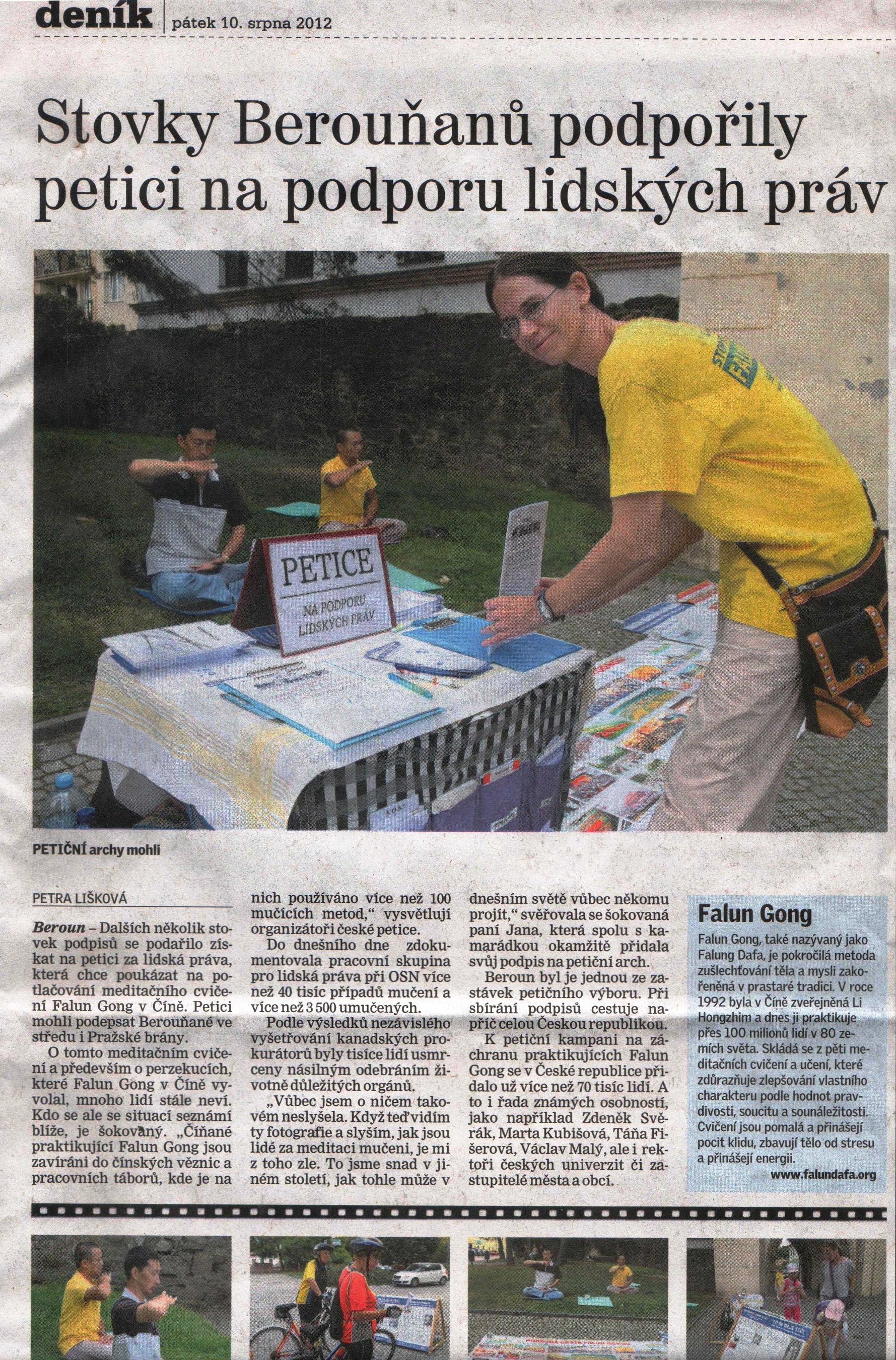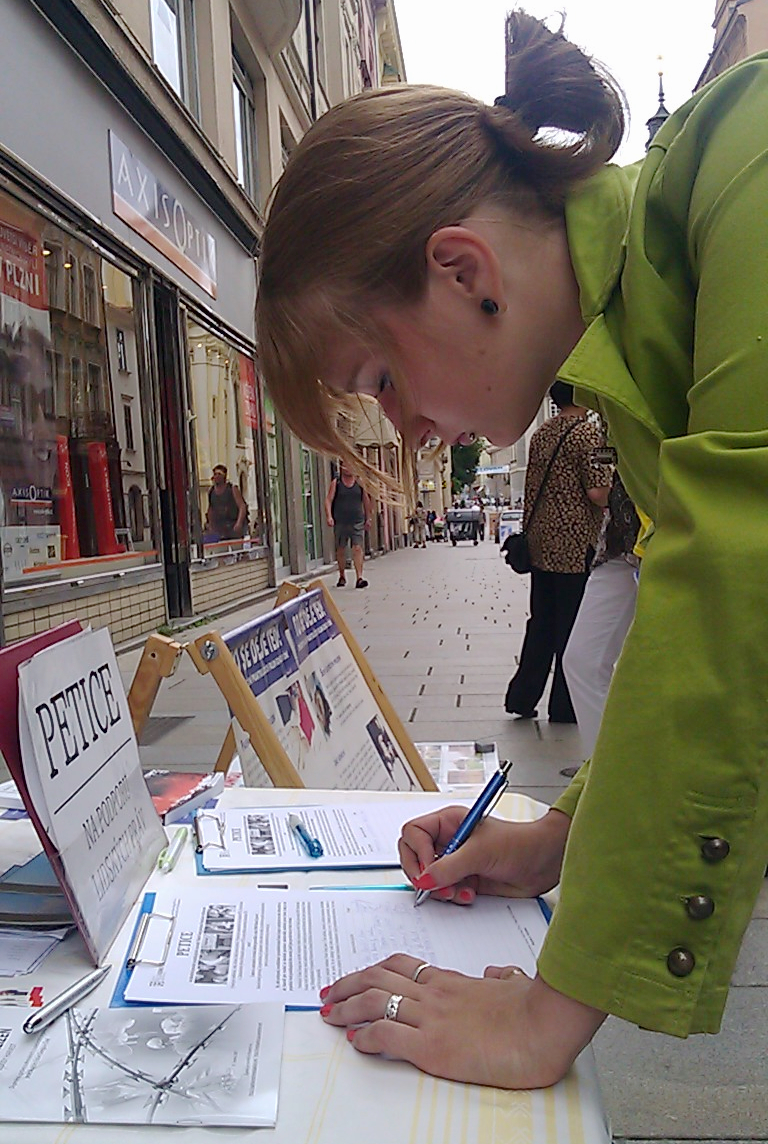 【明慧网二零一二年八月十五日】二零一二年八月六日、八日和九日,捷克法轮功学员分别在皮尔森(Plzen)、贝隆(Beroun)和普希布拉姆(Pribram)三个小城举行征签活动,谴责中共对法轮功的迫害,呼吁捷克共和国议会参、众两院的人权、外事委员会支持并推动制止迫害法轮功的议案。很多捷克人在请愿信上签名,人们了解真相后谴责中共的暴行。《贝隆日报》报道说,目前在捷克共和国已经有超过七万民众签名反对中共对法轮功的迫害。