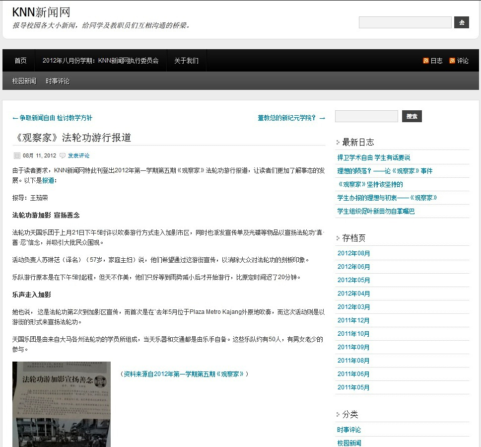 八月十一日,KNN新闻网就读者的要求,特别再次刊登出二零一二年第一学期第五期《观察家》法轮功游行报道,让读者们更加了解事态的发展。以下是有关报道: