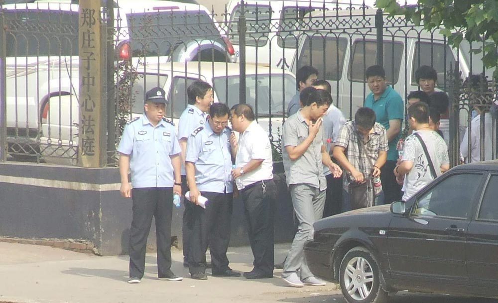 开庭当天,法院外警察、便衣密布,如临大敌。不但有来自开平国保大队的赵春生(大队长)、陈树记,还有来自唐海县国保大队的李福国以及唐山市国保大队的高会祥,唐山特警也在现场出现,可谓倾巢出动。据知情人透露,此次非法开庭共出动了一百二十多名警察和四十多名法警。警察、便衣和警车不但布满了法庭内和法庭外的街道,就连附近的银河路车厂以及居民小区银联花苑内也是大量的警察和警车。有一辆专门的摄像车在法庭外的附近区域来回巡视,对着所有的人录像。各处的警察不停的驱赶着路边的行人。