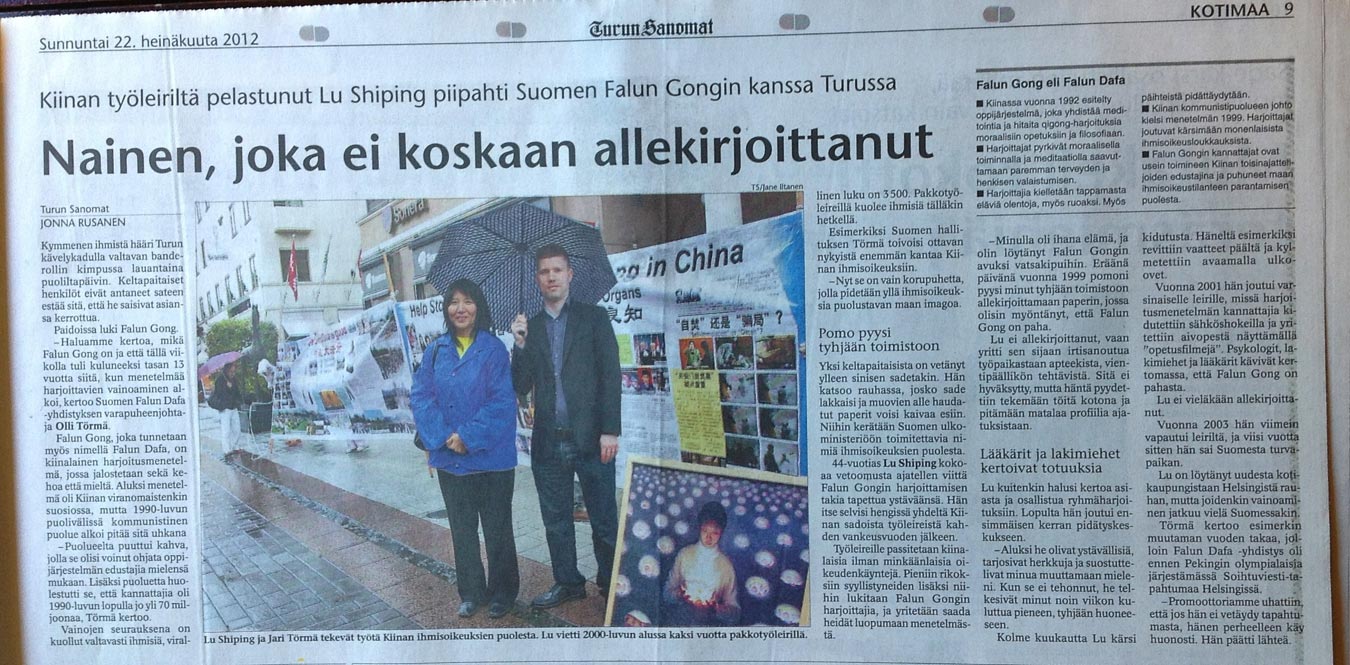 【明慧网二零一二年八月二日】位于芬兰南部的城市图尔库是芬兰旧首都,也是芬兰最古老的城市,人口十八万,图尔库悠久的历史使它一直处于芬兰文化和商业中心的地位。二零一二年七月二十二日,图尔库最大报纸《图尔库日报》报道了芬兰法轮功学员的七二零迫害活动,详细介绍了法轮功以及其在中国遭迫害的情况。